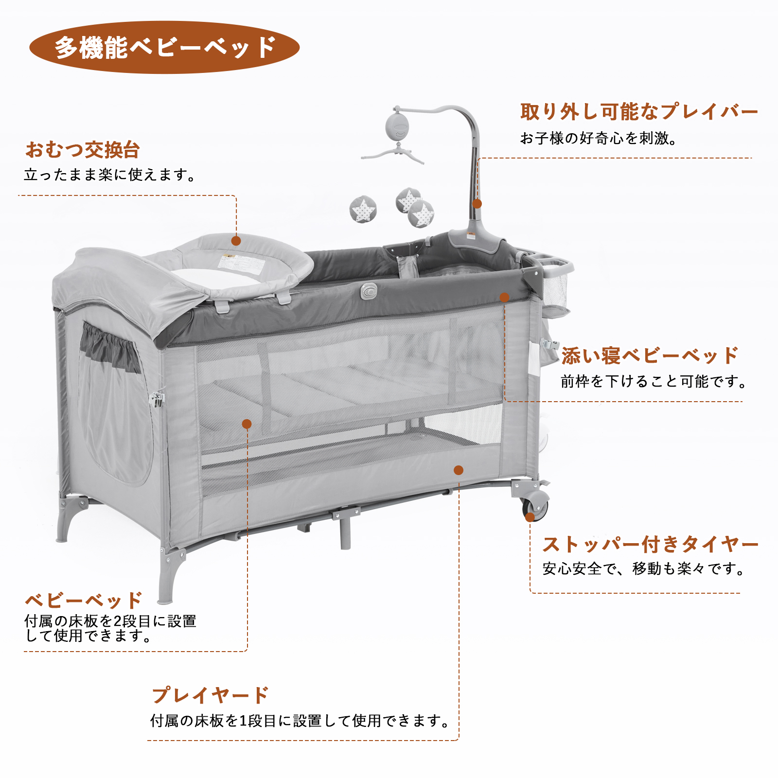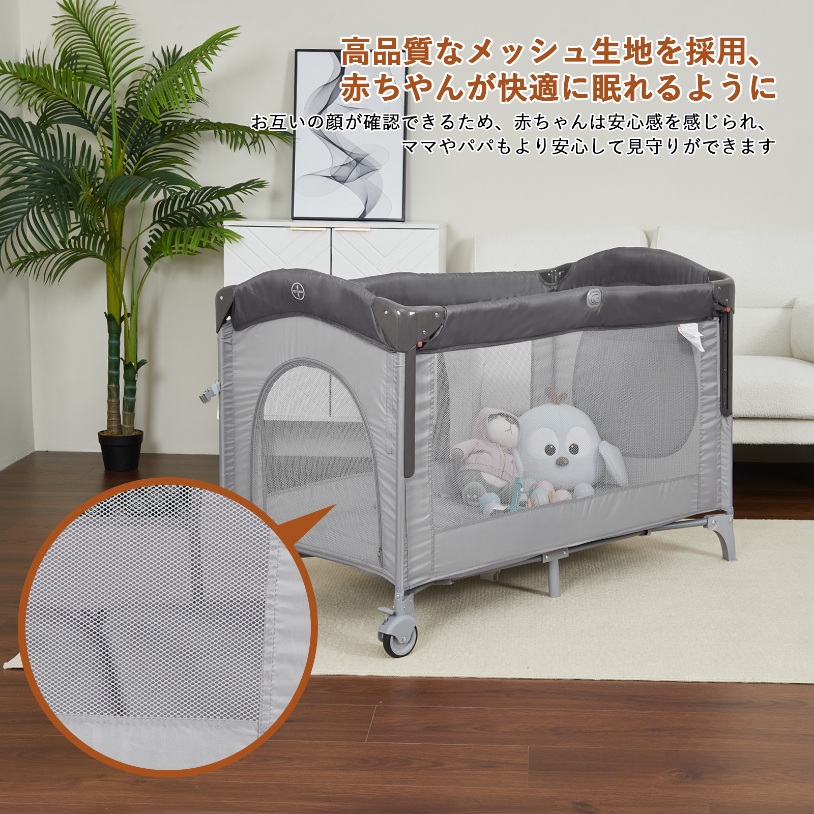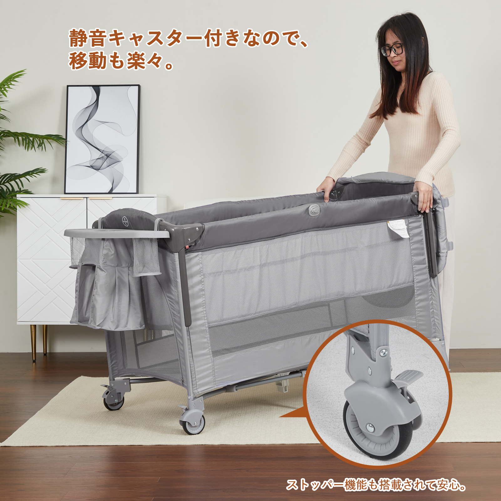 【安心設計】静音キャスター付きで、床を傷つくことなくリビング、寝室への移動も楽々です。ベビーベッドのサイドメッシュ設計は、親子がお互いの姿を確認でき、赤ちゃんの様子を常に見守れる安心感があります。