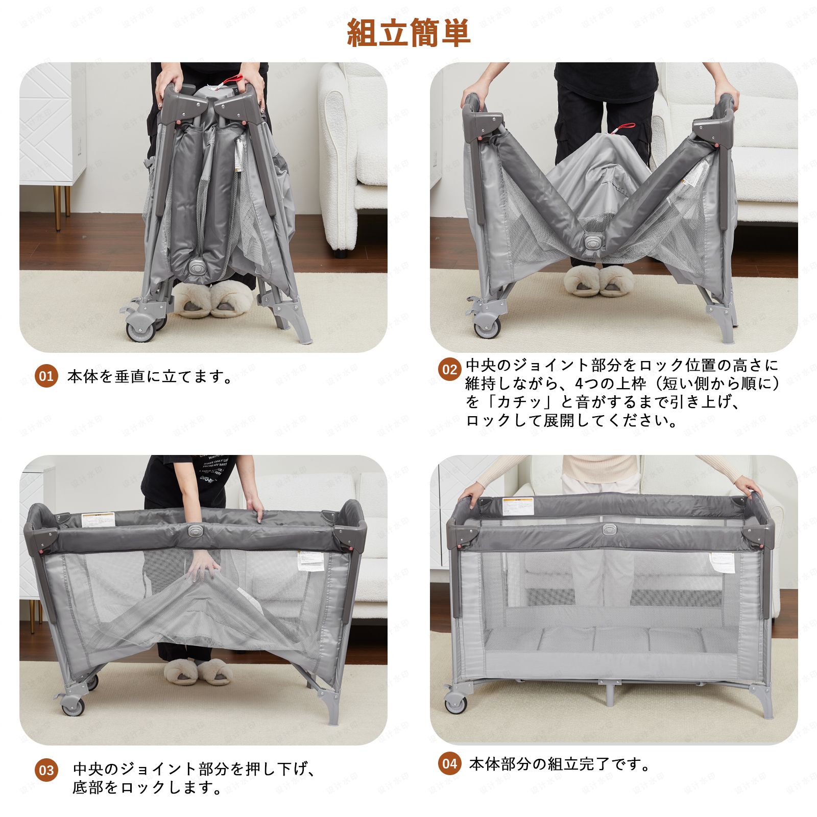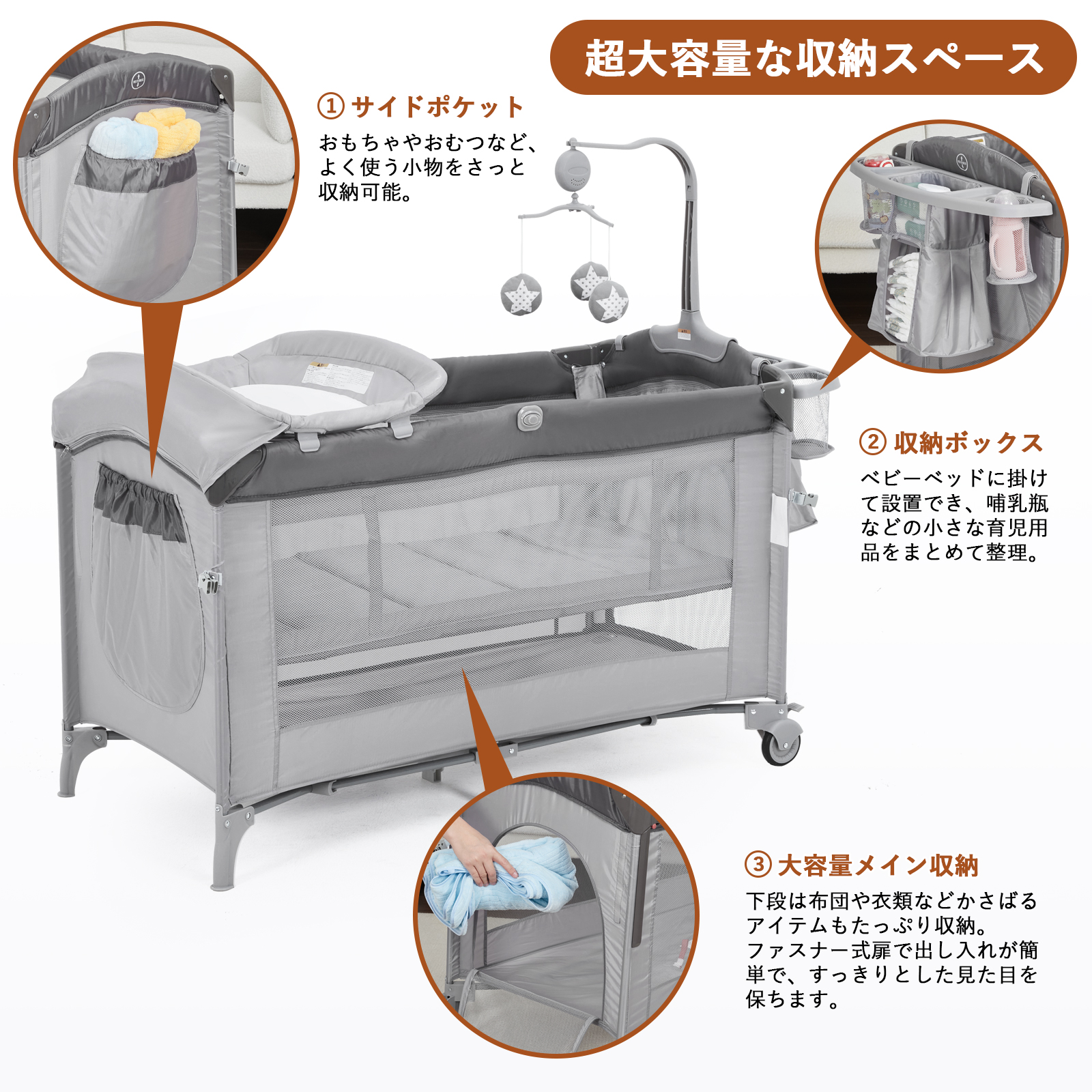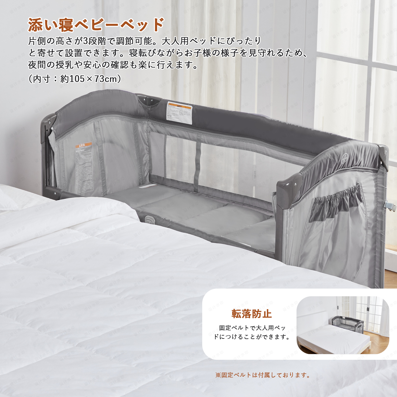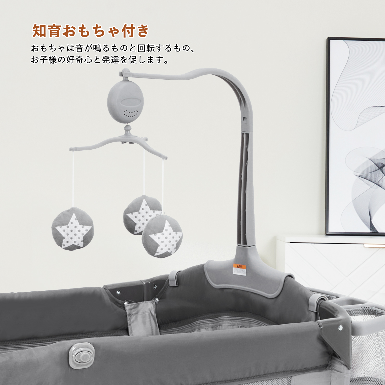 【安心設計】静音キャスター付きで、床を傷つくことなくリビング、寝室への移動も楽々です。ベビーベッドのサイドメッシュ設計は、親子がお互いの姿を確認でき、赤ちゃんの様子を常に見守れる安心感があります。