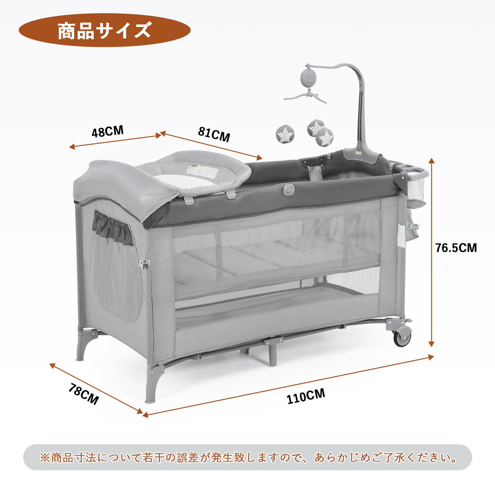 【商品詳細】 対象月齢: 新生児(体重2.5kg)〜36カ月(体重13.6kg)。使用期間:上段:新生児~つかまり立ちできる頃(概ね生後6カ月) 、体重9kg以下。下段:つかまり立ちできる頃(概ね生後6カ月)〜36カ月まで、体重13.6kg以下。素材:鉄製パイプ +オックスフォード生地。本体展開サイズ:65*125*76cm、本体収納サイズ:29.5*28*80cm、本体重さ:14kg、おむつ交換台サイズ:48*81cm。