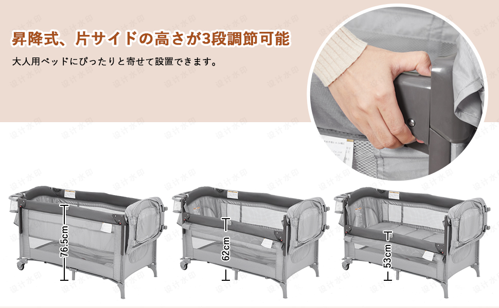 【添い寝モード&プレイヤードモード】固定ベルトでベビーベッドを大人用ベッドに固定でき、3段階調節可能の前枠が下げられるから添い寝ができるベビーベッドになり、安心して赤ちゃんのお世話ができます。マットレスを下段に取り付けるとベビーサークルになります。