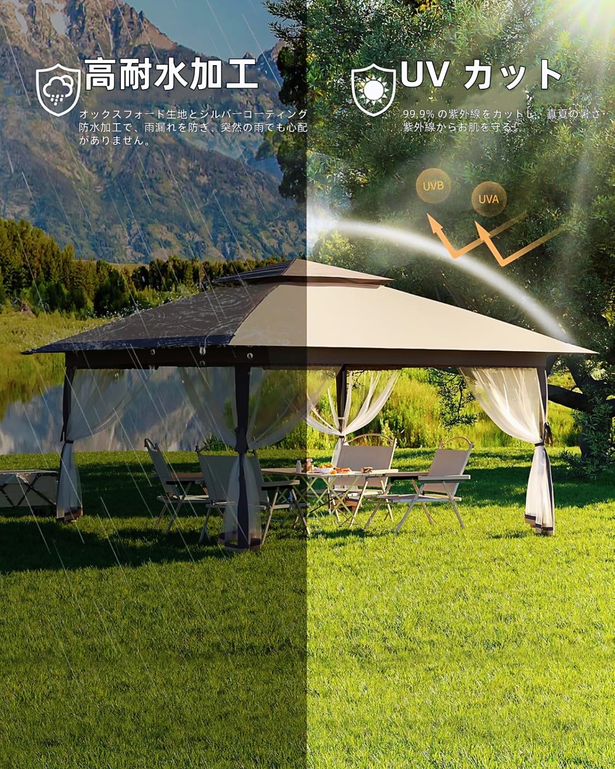 【高品質オックスフォード生地&防虫ネット】300Dシルバーコート生地採用。UVカット率99.9%、防水性も高く、細目メッシュで虫を防ぎながら通気性も確保します。