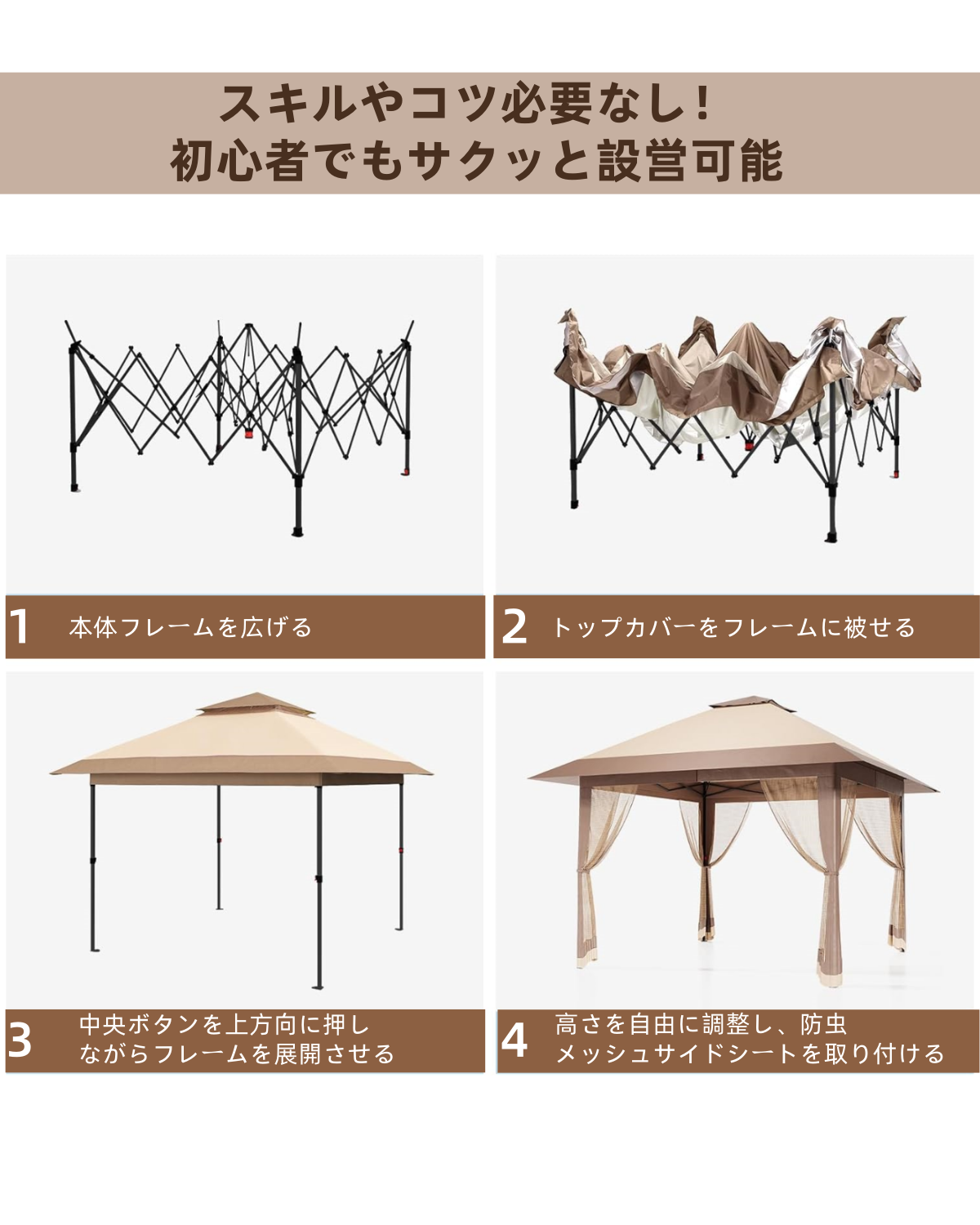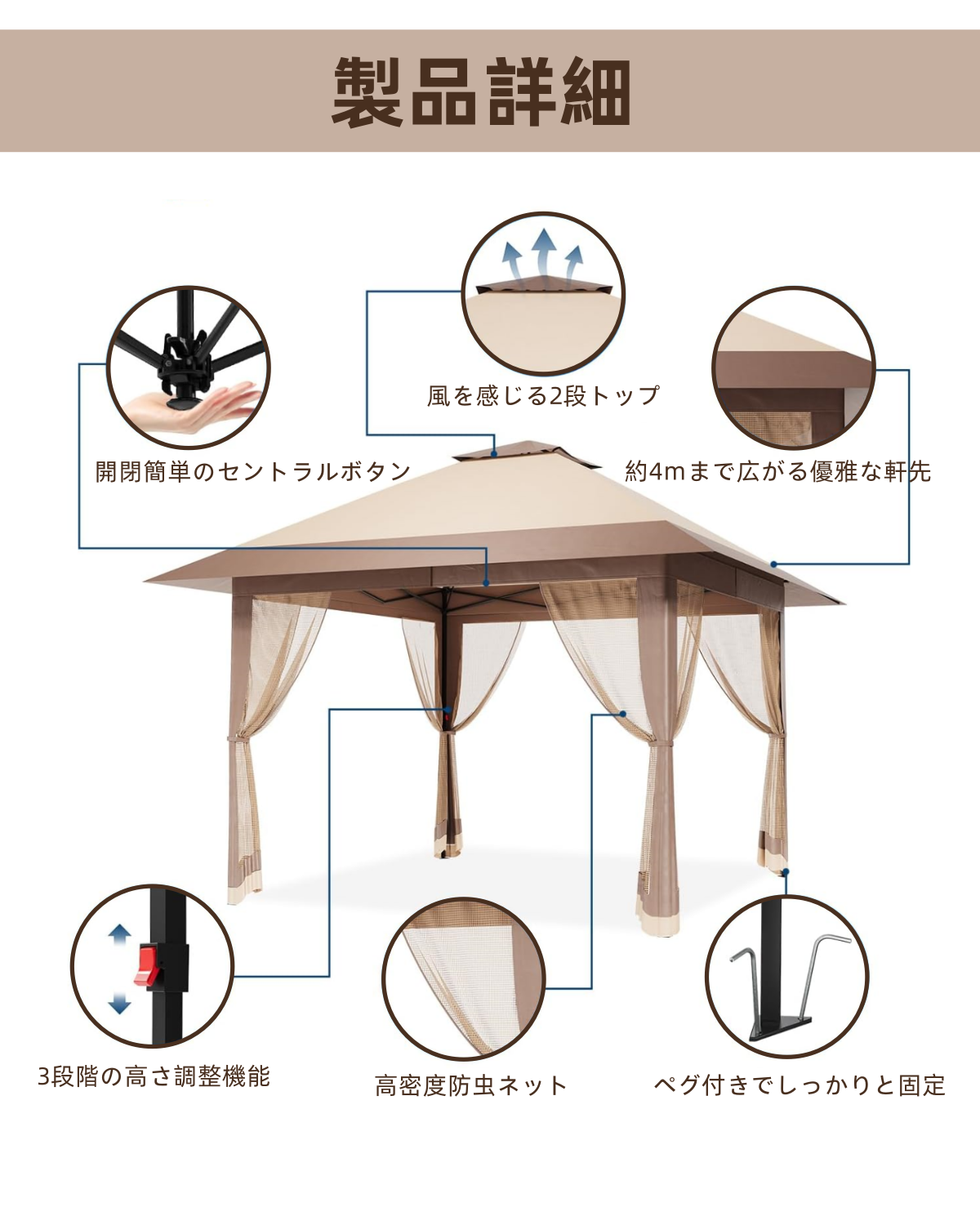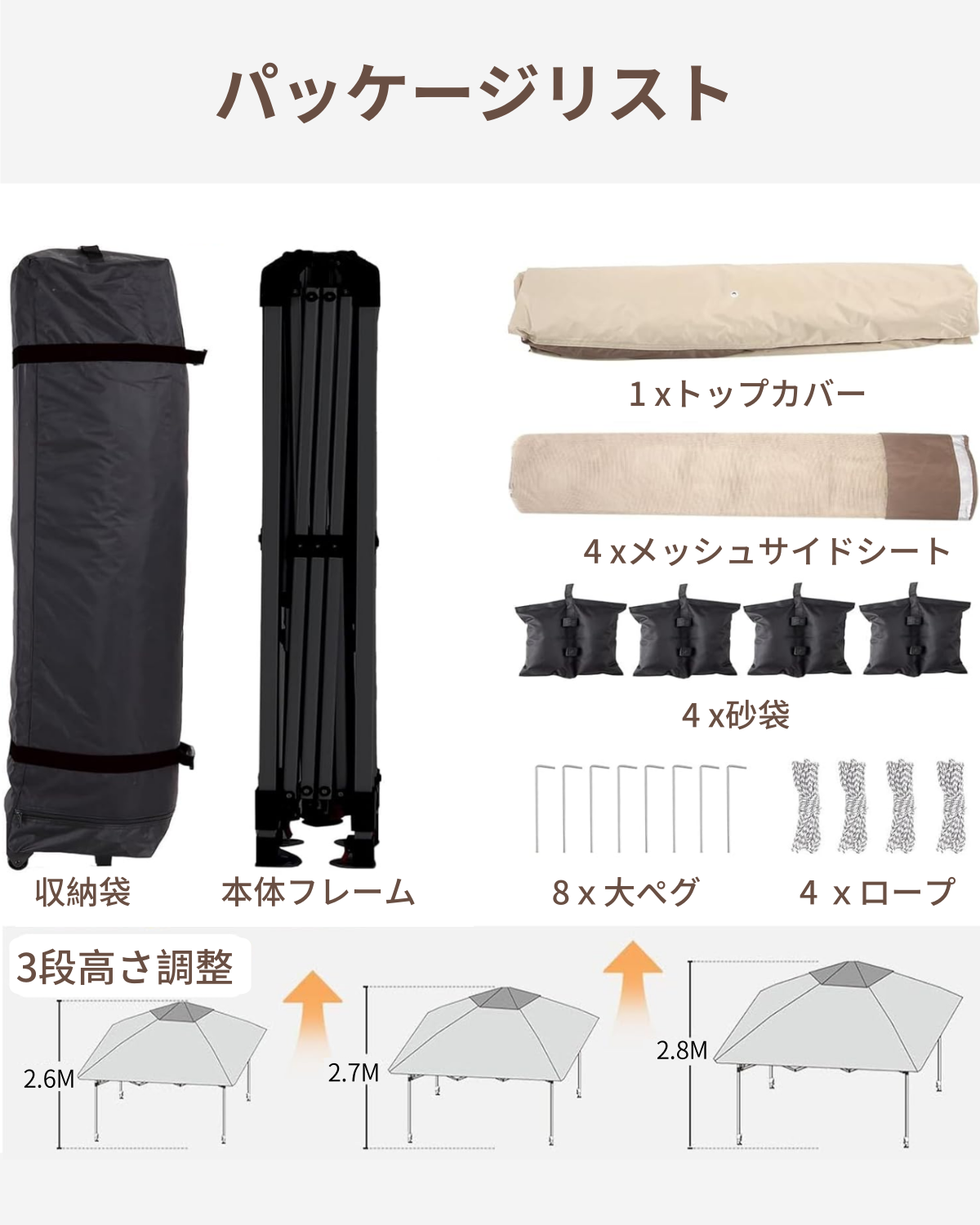 【3段階高さ調節可能】高さ2.6m/2.7m/2.8mの3段階調節可能。キャンプ、BBQ、イベントなど様々なシーンで活躍します。