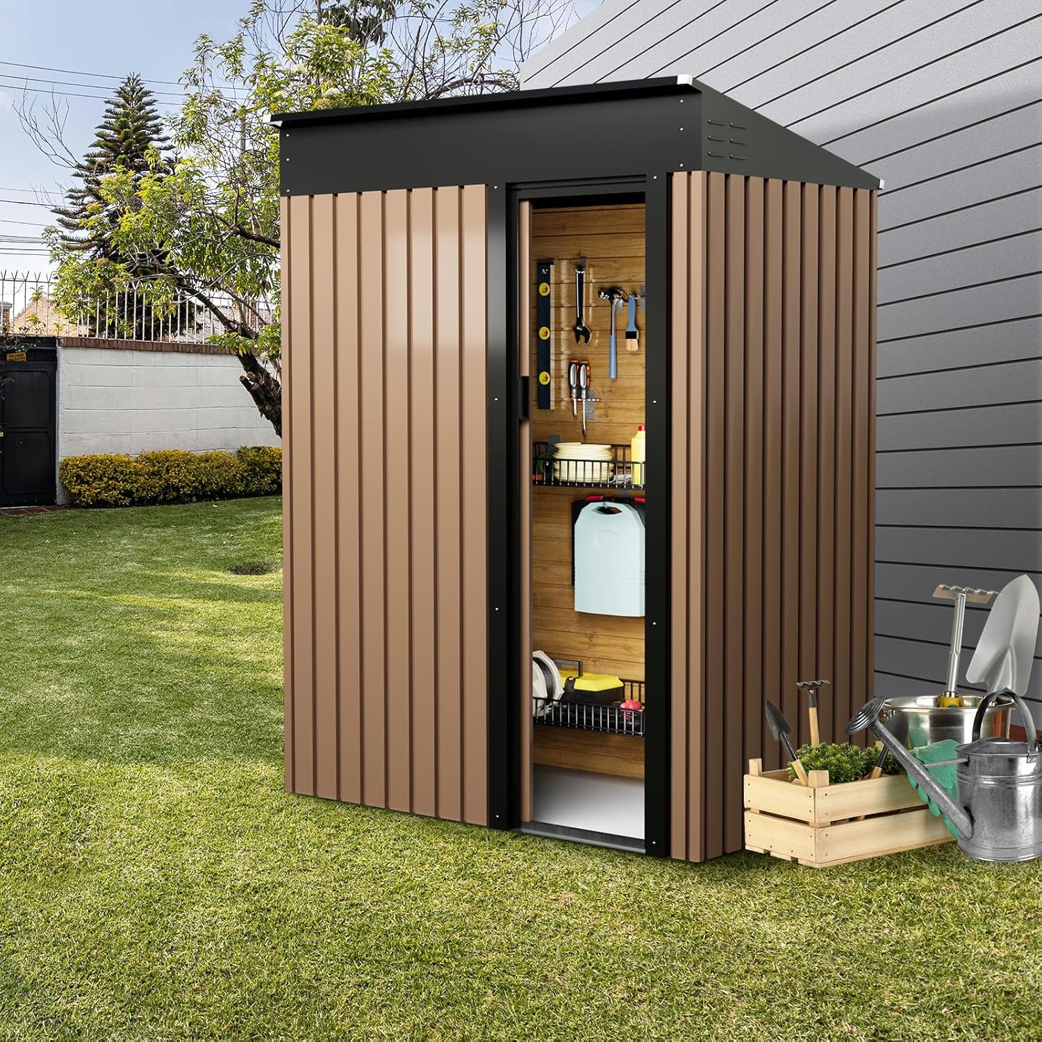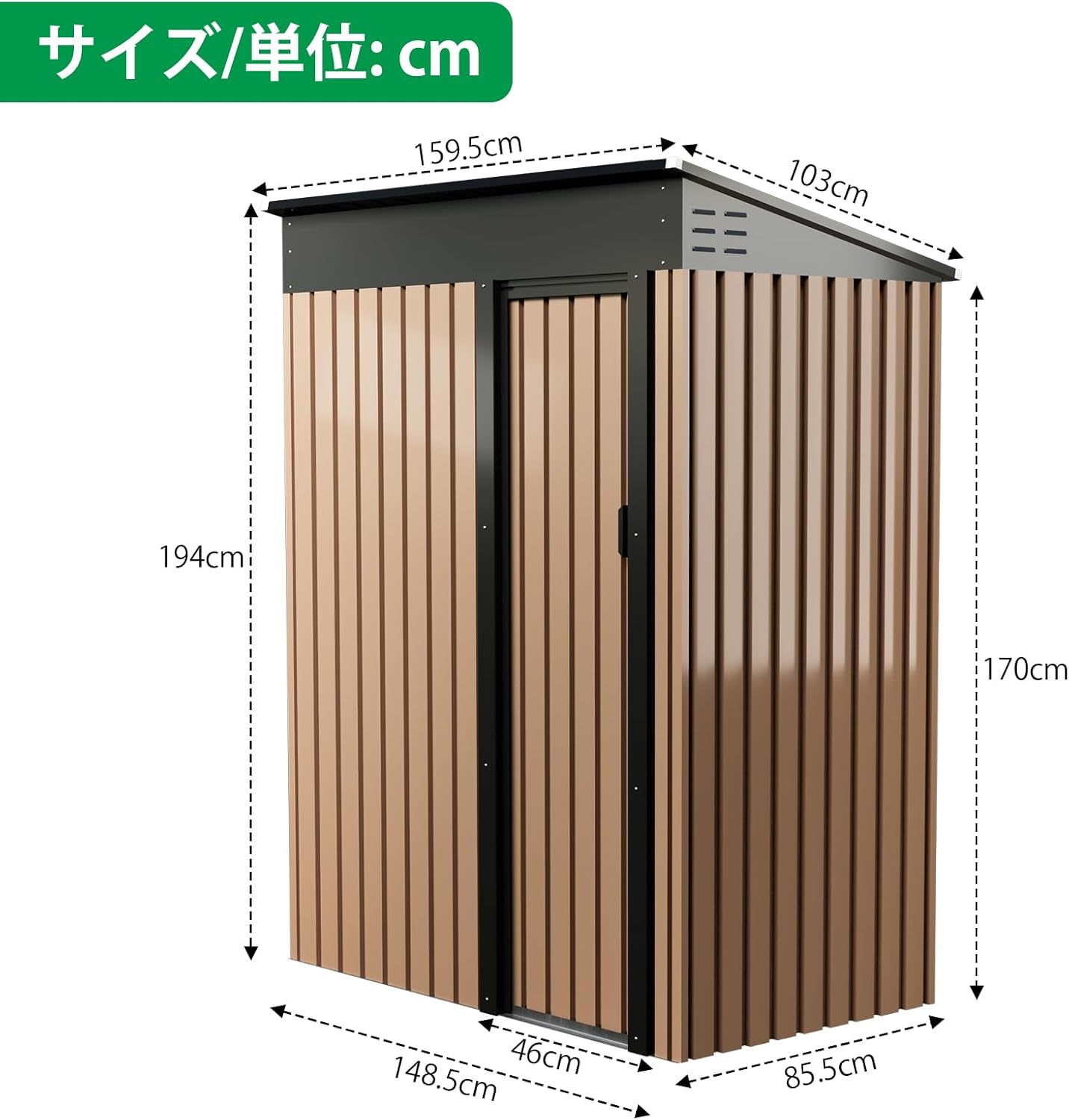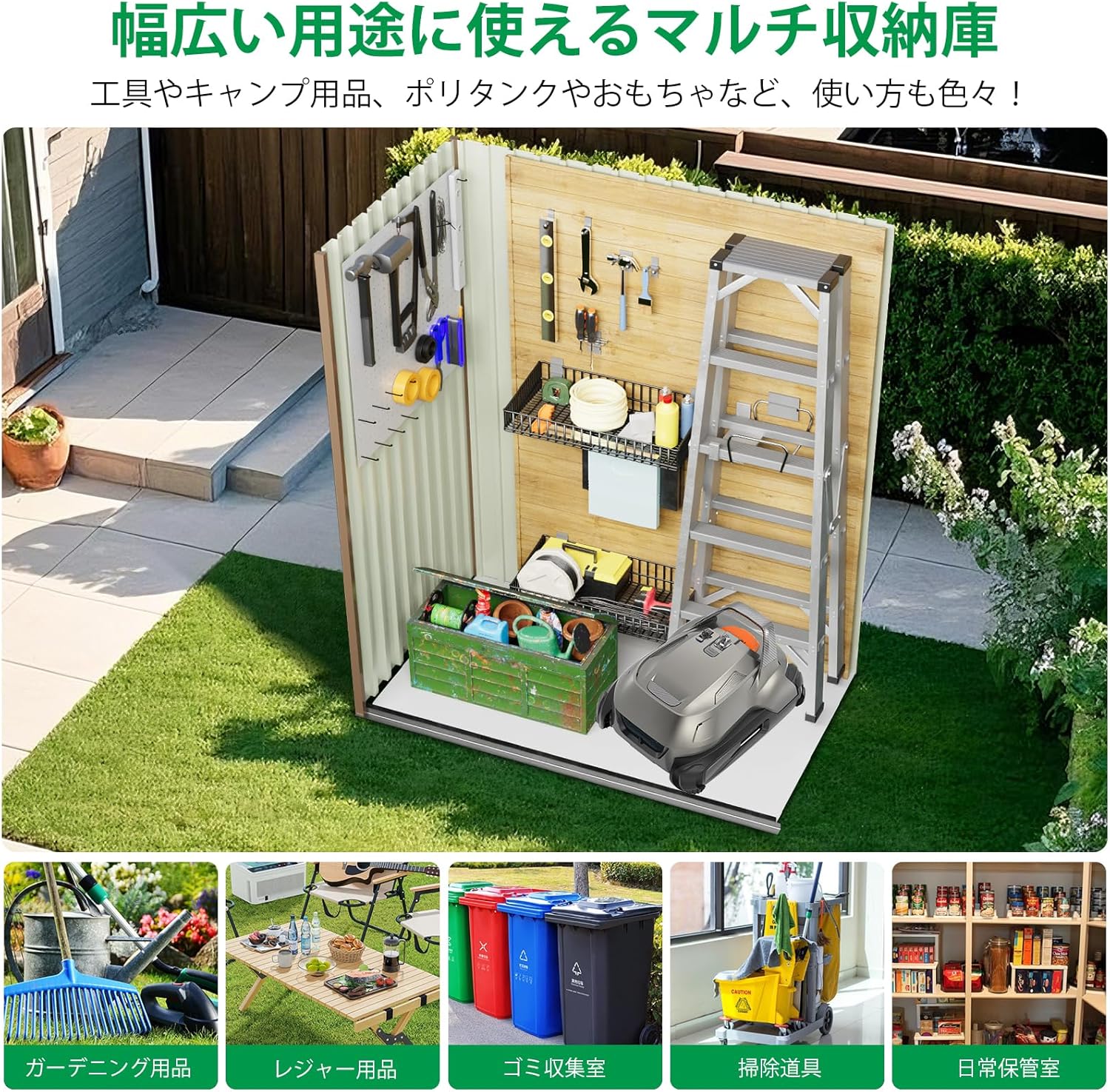 【大容量収納】幅148.5×奥行85.5×高さ194cm。芝刈り機、自転車、アウトドア用品など様々な物品をしっかり収納でき、庭を清潔に整頓できます。