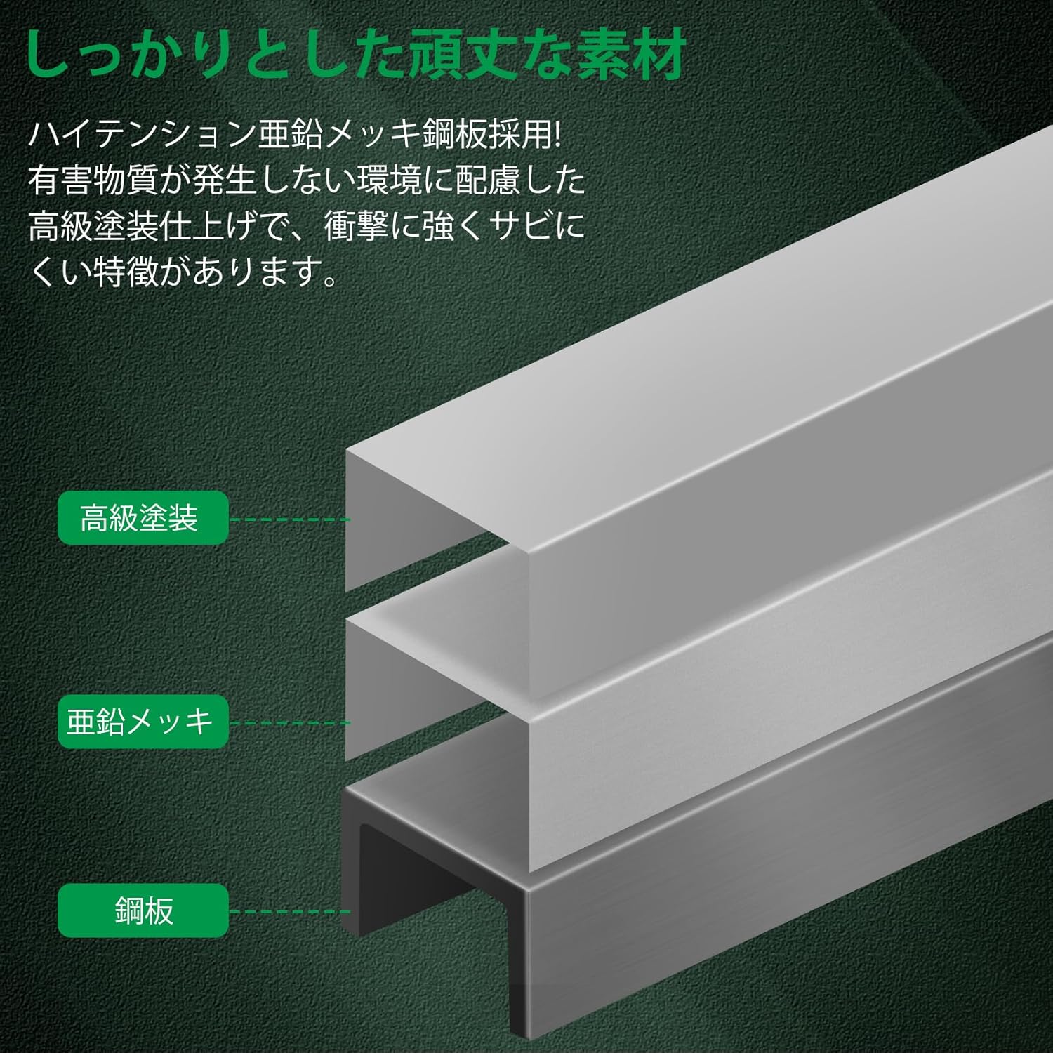 【超耐久設計】特殊3層防錆処理(亜鉛メッキ+防錆塗装+粉体塗装)で塩水噴霧試験1000時間クリア。凹凸強化構造(特許出願中)で耐圧性能30%向上、IPX4防水で過酷な環境でも錆を徹底ブロック。