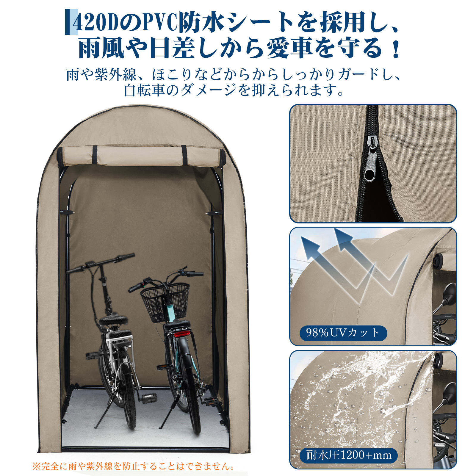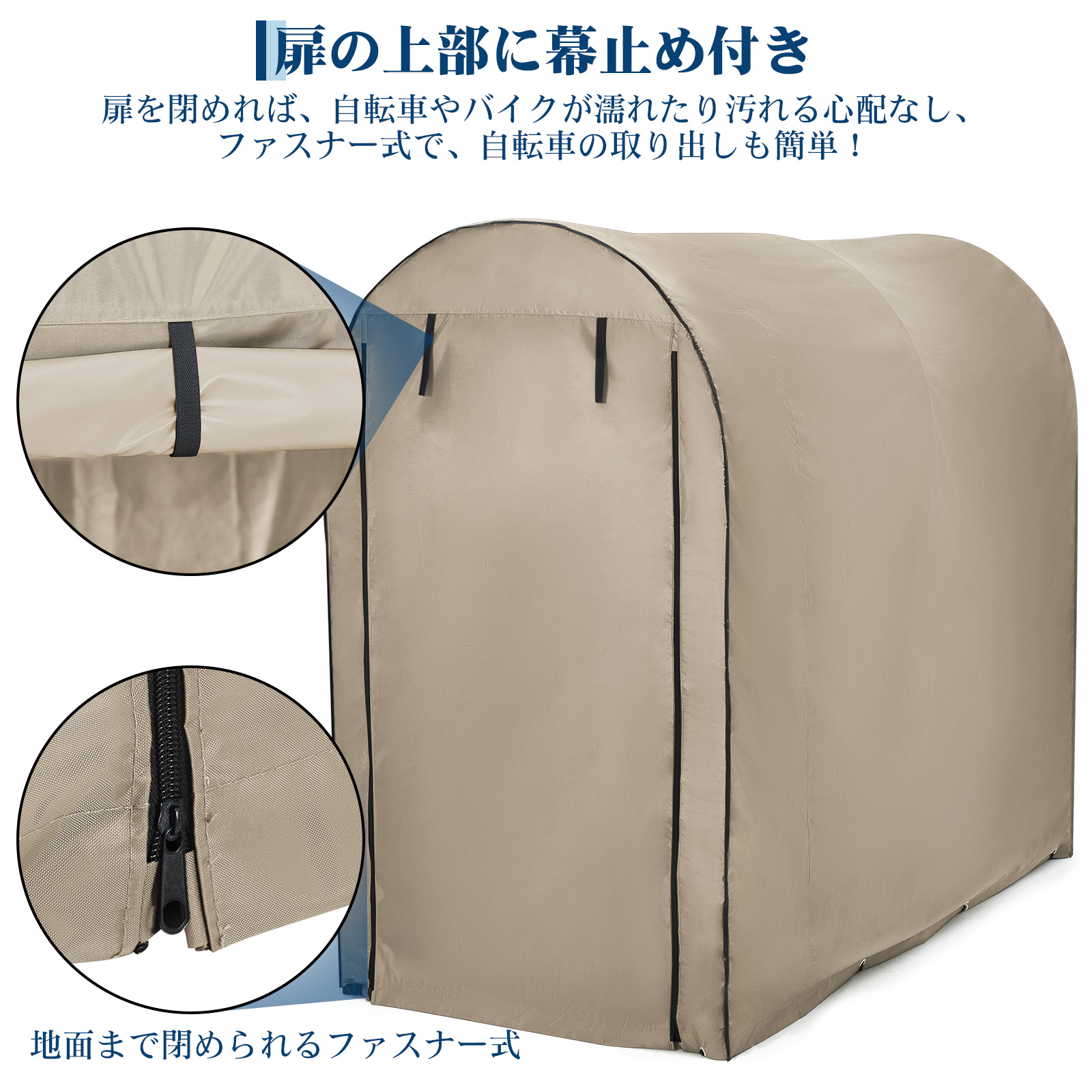 扉を閉めれば、自転車やバイクが濡れたり汚れる心配なし、ファスナー式で、自転車の取り出しも簡単です。