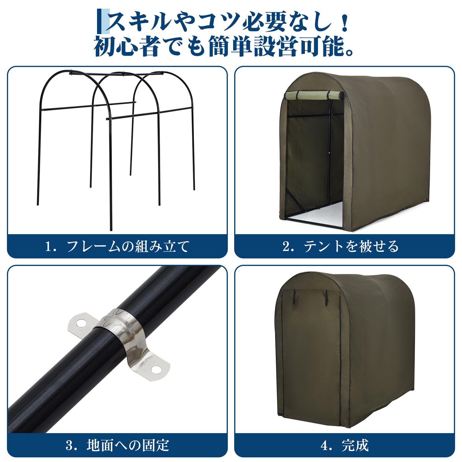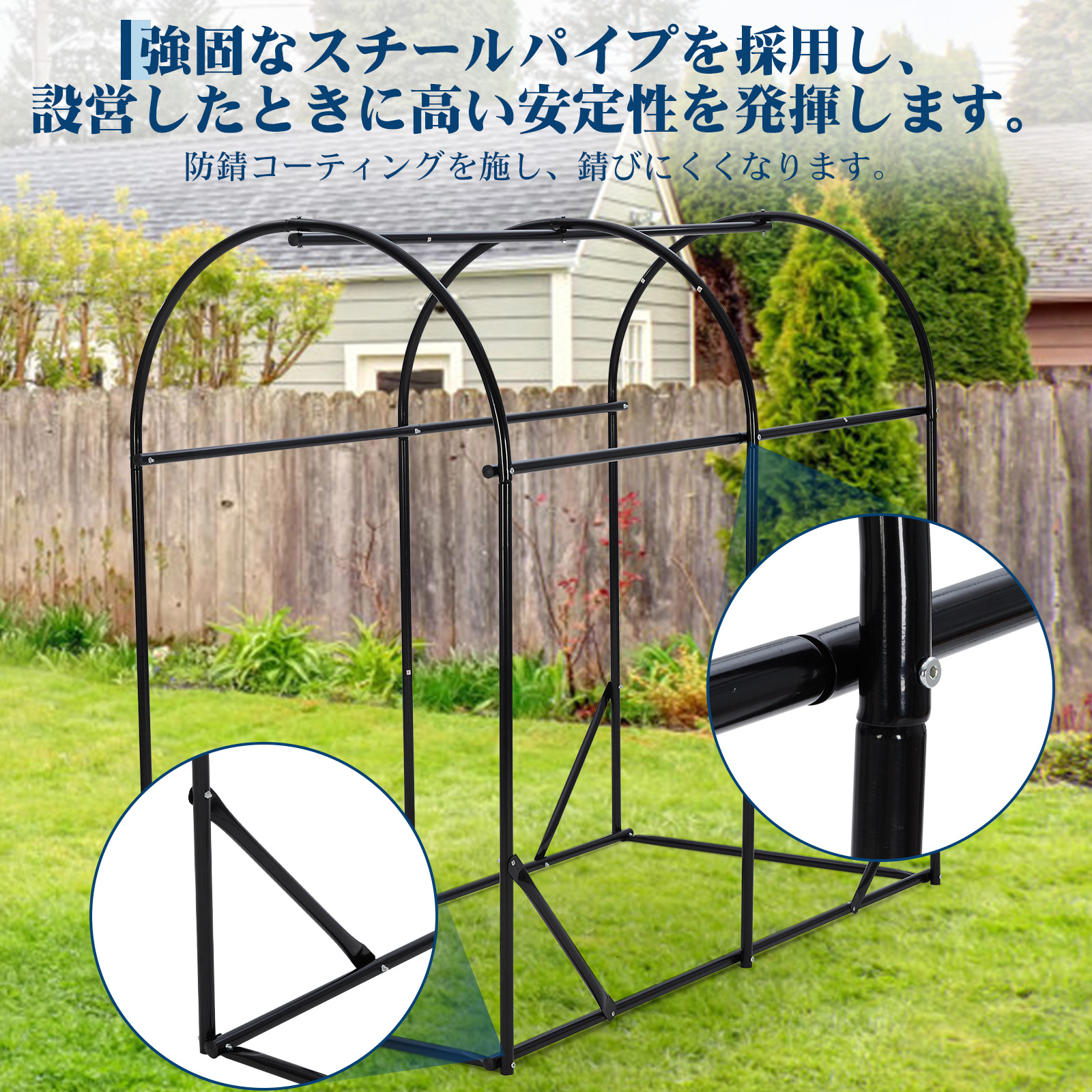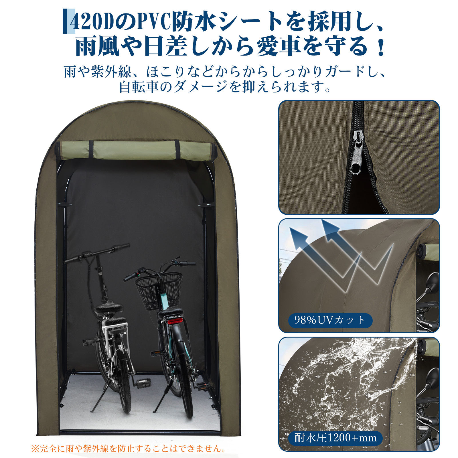 | 製品特徴 | 自転車やバイクなどの収納に便利なサイクルハウスです。 【3サイズから選べる】 収納できる自転車の台数は最大5台ほど収納できるモデルが展開されています。余裕をもったサイズを選ぶとハウス内が広く使えます。 【強固なスチールパイプ】 強固なスチールパイプを採用し、設営したときに高い安定性を発揮します。 防錆コーティングを施し、錆びにくくなります。 【高品質オックスフォード生地】 素材は420Dオックスフォード生地を使用しており、耐久性、撥水性また耐候性に優れます。 【扉の上部に幕止め付き】 扉を閉めれば、自転車やバイクが濡れたり汚れる心配なし、ファスナー式で、自転車の取り出しも簡単です。 【雨や紫外線、ほこりなどからからしっかりガードし、自転車やバイクのダメージを抑えられます。お家に置けないタイヤやガレージ用品の保管、ガーデニング用品やキャンプ用品の収納にも活用できます。】 |