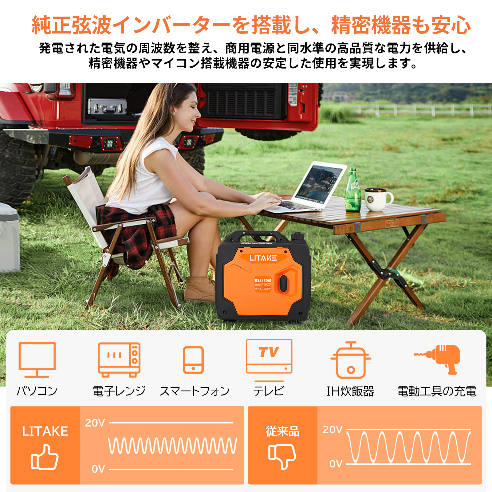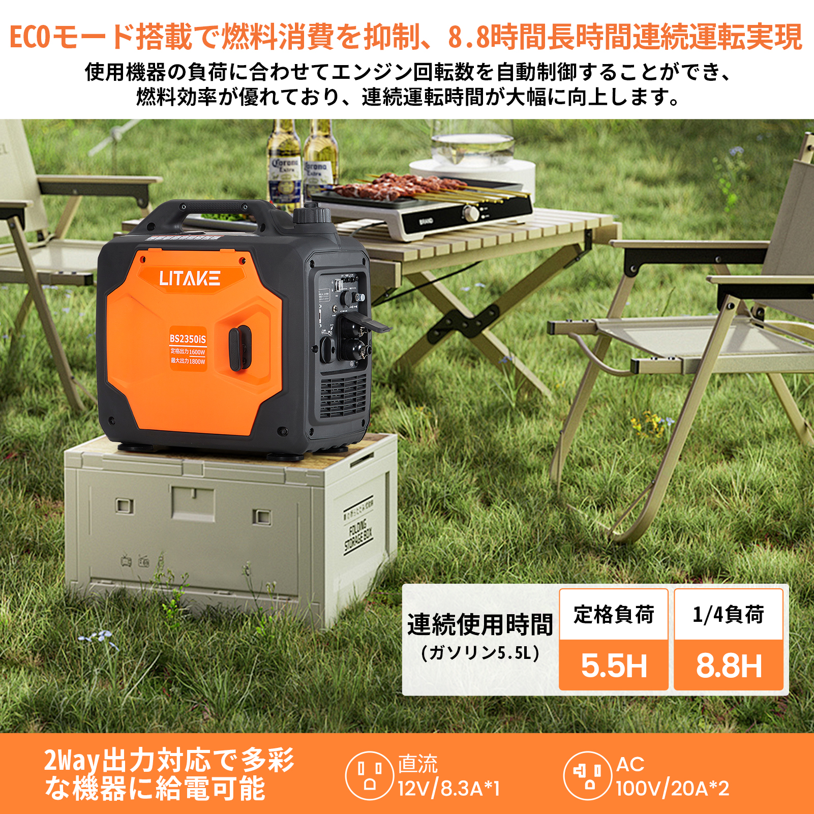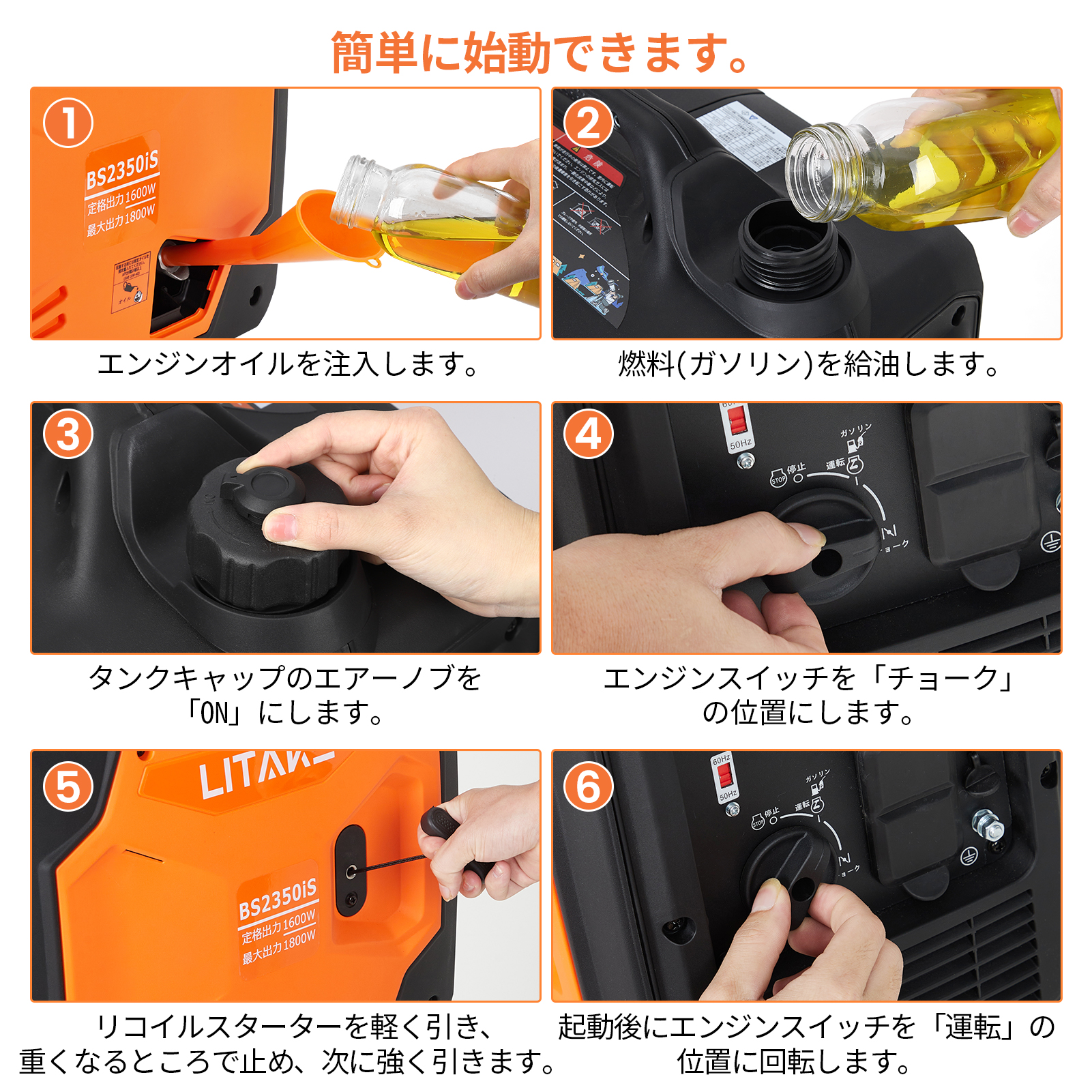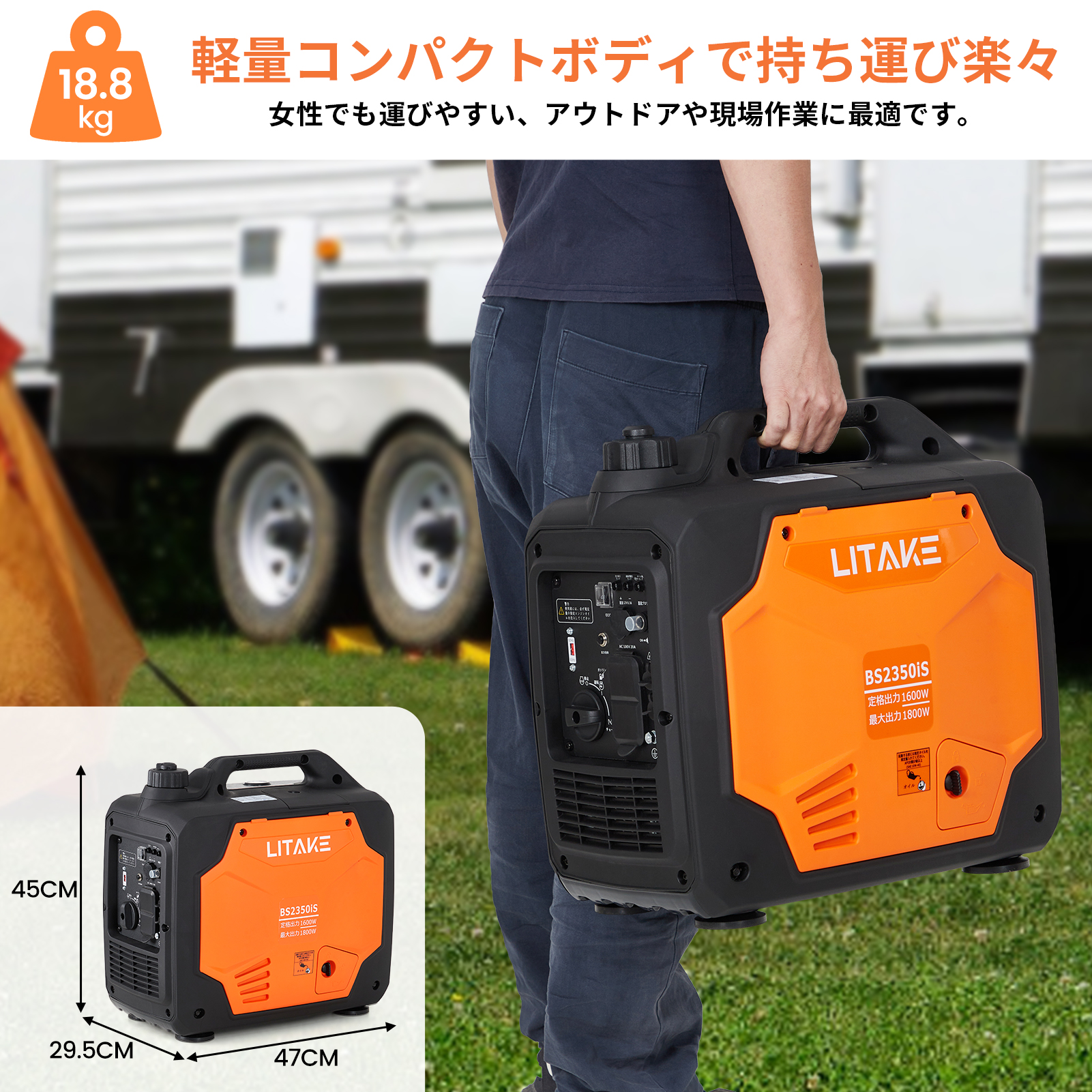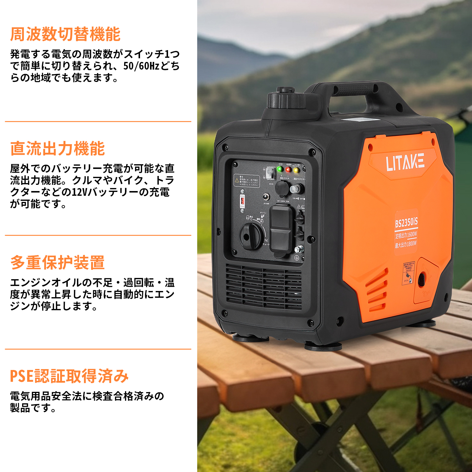 インバーター発電機 定格出力1.6kVA 最大1800W高出力 防音型 正弦波 ガソリン発電機 並列運転 50Hz/60Hz切替 過負荷保護 オイル不足警告 BS2350iS