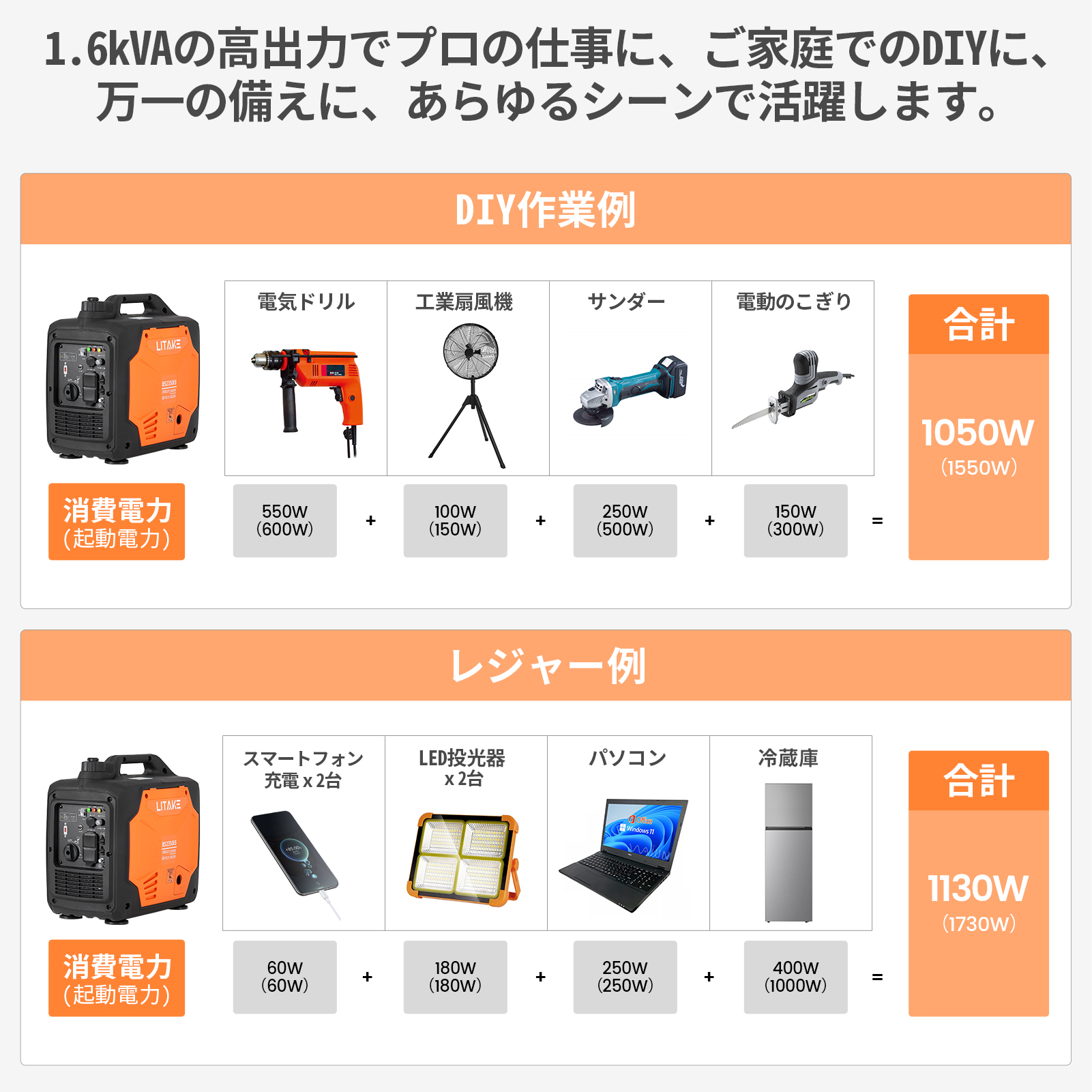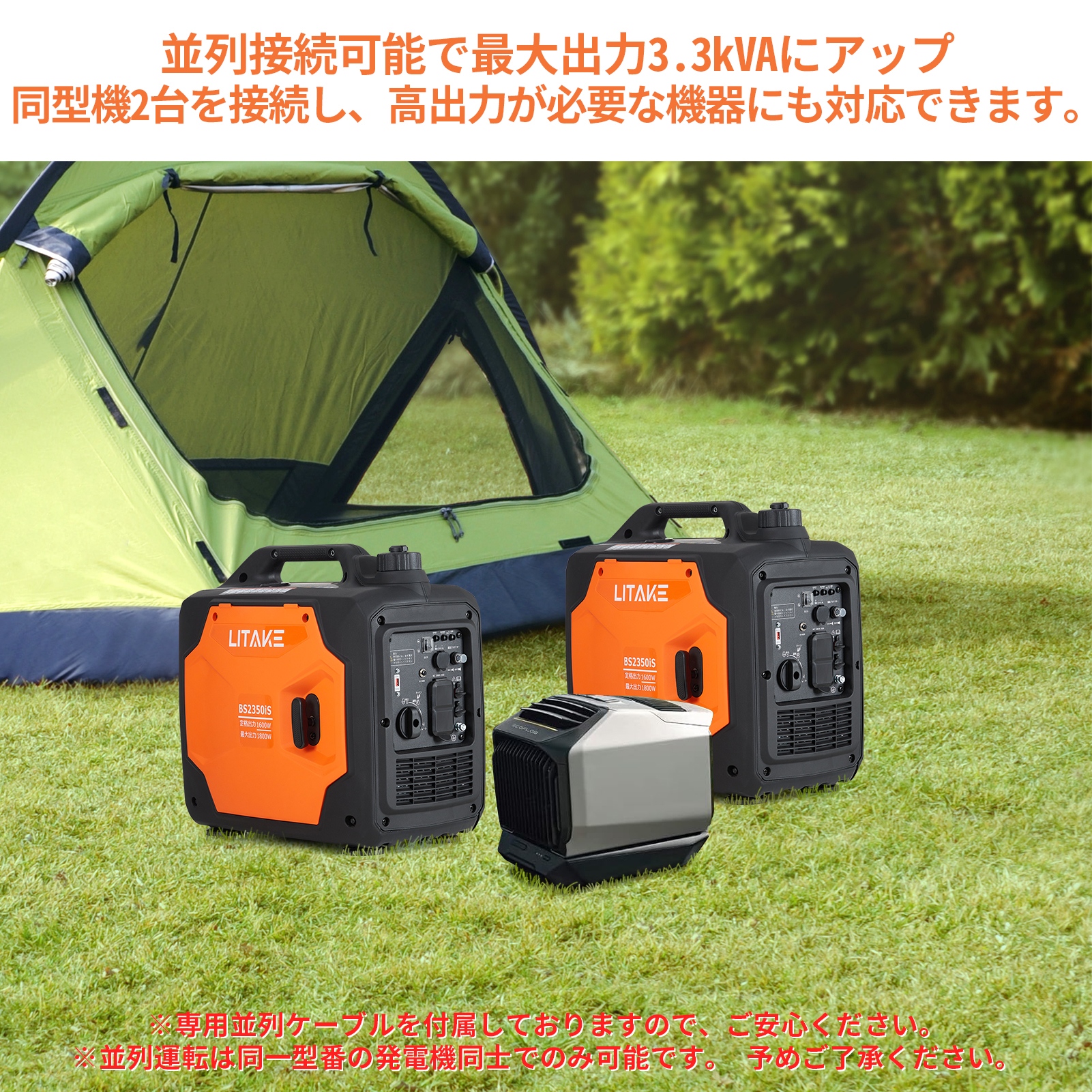 【並列接続・多重保護装置】2台を並列に接続し、最大3kVAの出力を発揮できます。幅広い家電に対応可能で、レジャーやアウトドア、さらには災害時にも活躍する大型インバータ発電機です。