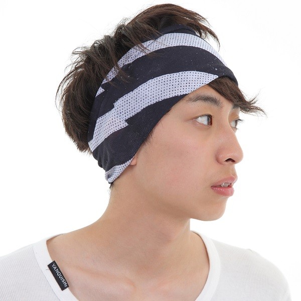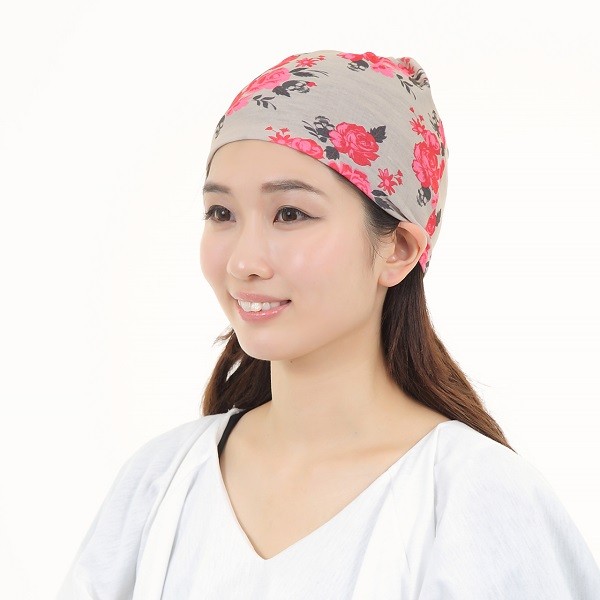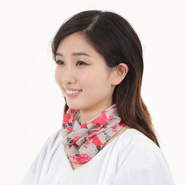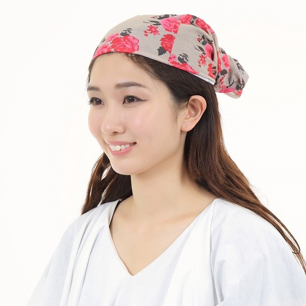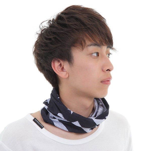 幅25cmのチューブ型の生地は心地よく伸びるので、頭からスッポリ被り、好みの形状で装着できる。