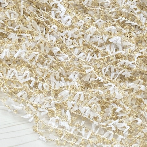真っ白のスラリットテープのハネとゴールドラメループの組み合わせて、上品で可愛らしいファンシーヤーンに仕上げました。ひらひらスラリットの反対側にラメループが連なってます。ゴールドラメは前回より濃い輝くタイプとなってます。他に、シルバー、オーロラ色もございます。