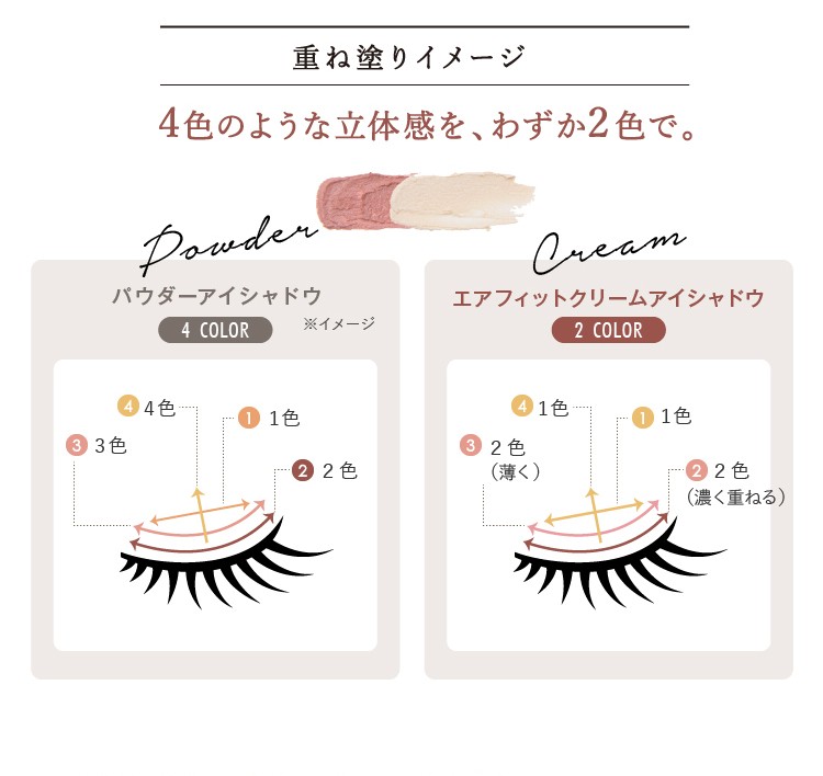 頑張らない。なのにいつも以上。業界初となる、2色のクリームアイシャドウが作り出す、ナチュラルなのに印象的な目元を、思いのままに表現できます。あなたの印象を最も左右する、目元の印象を思いのまま作り出し、いつも以上に仕上げてくれます。馴染むナチュラル発色
