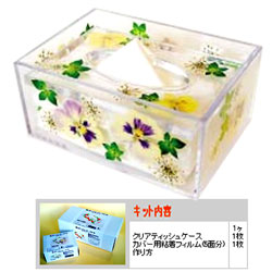 クリアティッシュケースと仕上げ用粘着フィルム(5面分)のキット 好きな押し花と組み合わせて華やかな押し花付ティッシュケースが簡単に作れます。 レギュラーティッシュサイズとポケットティッシュサイズの2種類があります。[セット内容]クリアティッシュケース 1ヶ カバー用粘着フィルム(5面分) 1枚 作り方 1枚 押し花は付属しません