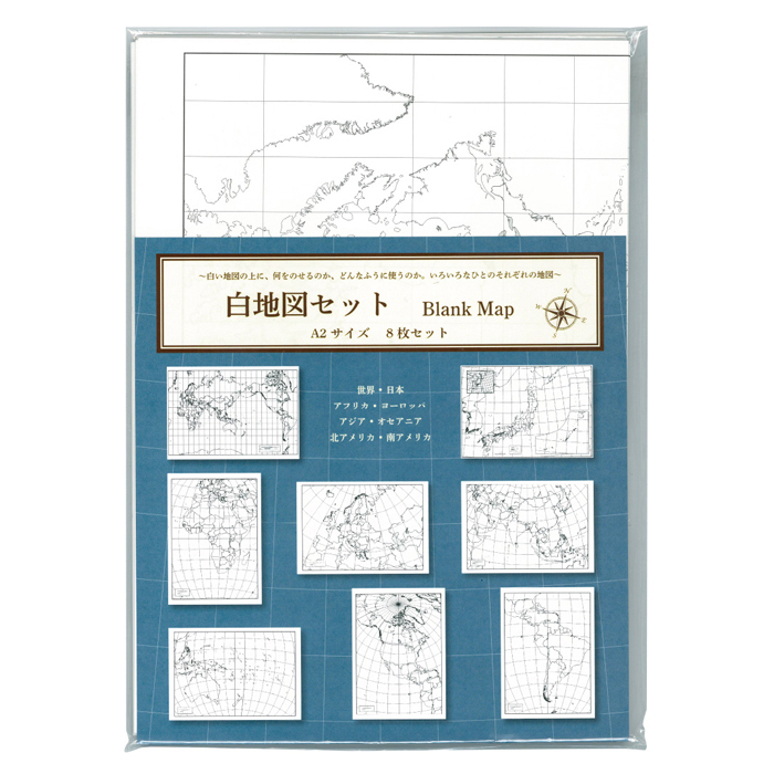 白地図8枚(世界・日本・アフリカ・ヨーロッパ・アジア・オセアニア・北アメリカ・南アメリカ) のセットです。