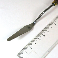 パレット上で絵具を混色したり、絵具とメディウムを混ぜたりするのにもつかいますが、作画において、筆には出せない独特のタッチを出すものとして非常に魅力的なものです。 平らにならせばテカテカした平面を作り上げる事が出来ますし、先端でカリカリ引っかく事も出来ます。へりを立たせてエッジを作ったり、ペタペタとしたタッチの書き方も面白いです。ひし形の中程度の大きさのものが一番良く使われ、初めてナイフを使ってみる場合にお薦めです。 細長いものや丸く小さいものなど、それぞれの形状に独特なタッチがあります。単純な道具だけに使い方次第で様々な面白い表現が出来るのも、このナイフの魅力です。 仕様変更にともない、マーク刻印なし。