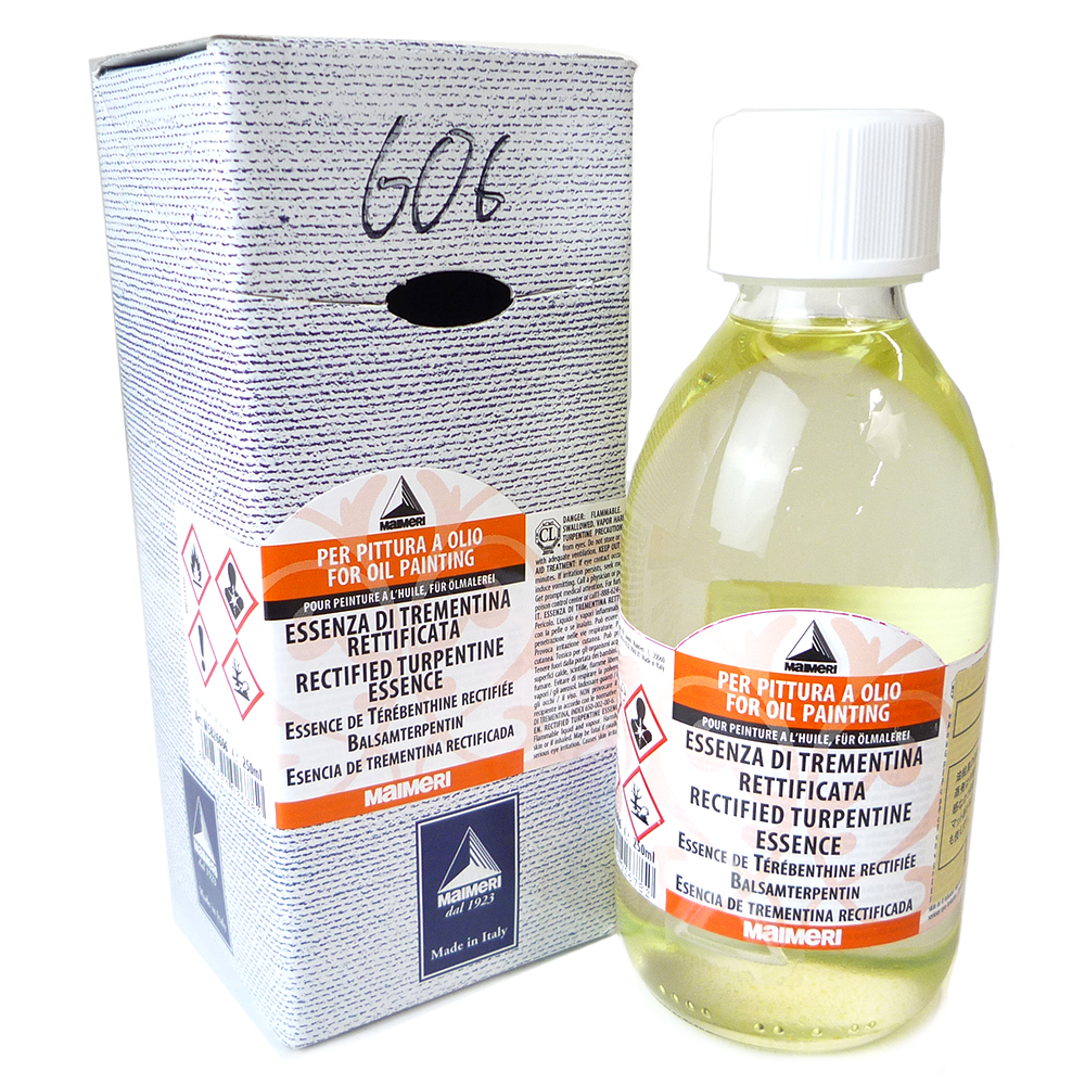 【主成分】テレピン油 (可燃性・有害) 【特性/使用法】油絵具の伝統的な植物性の希釈液。蒸発は中程度。 特有の臭いが有り、光と空気に敏感なので保管は冷暗所が最適。 絵具と混ぜるとマット感を与える傾向があります。筆洗油としても使えます。