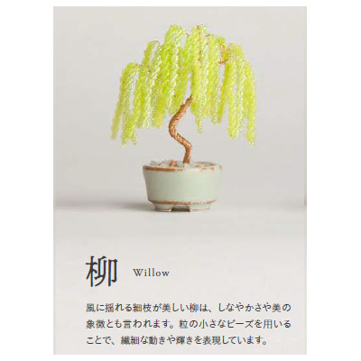風に揺れる細枝が美しい柳は、しなやかさや美の象徴とも言われます。粒の小さなビーズを用いることで、繊細な動きや輝きを表現しています。