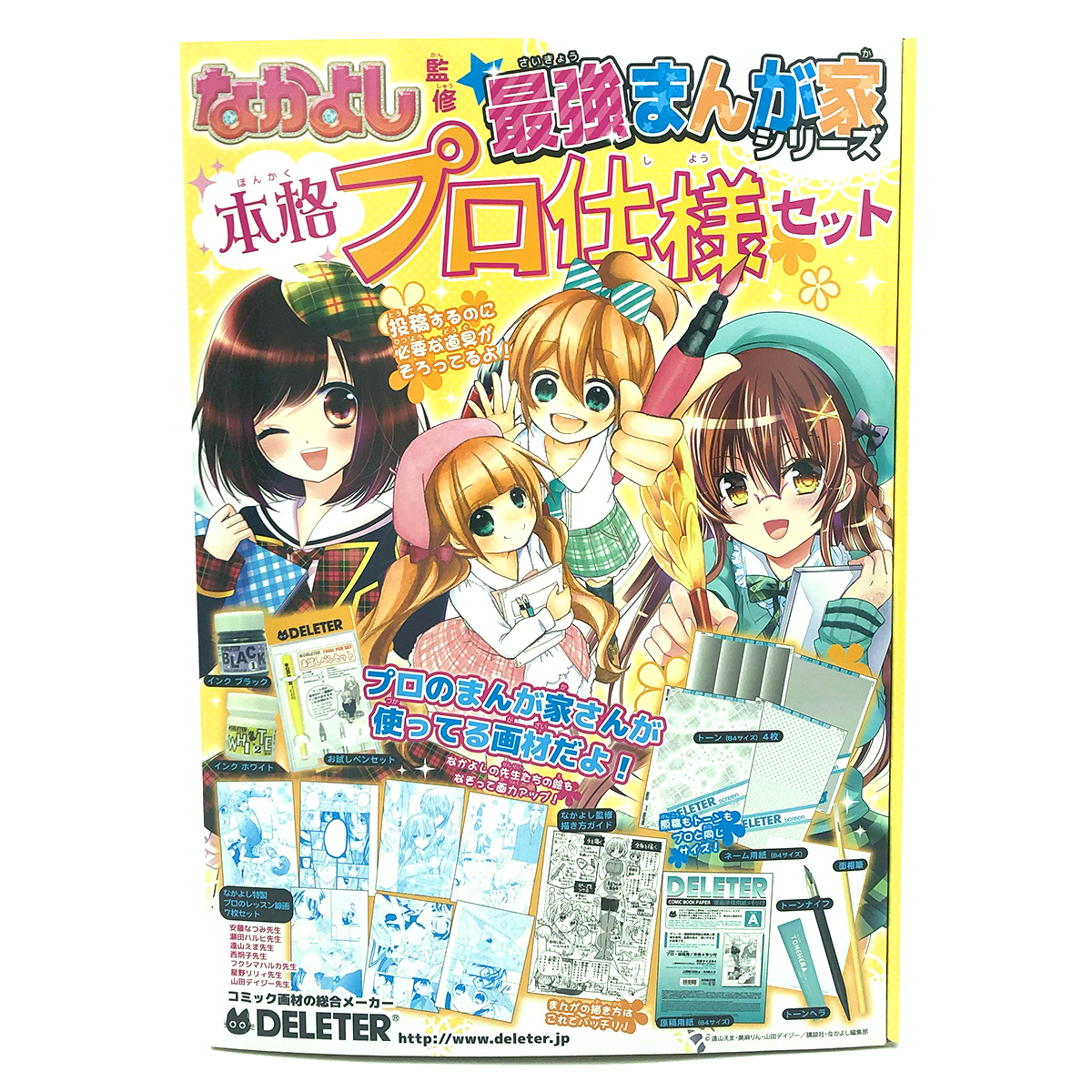 なかよし「最強まんが家」シリーズ スペシャルな作画アイテムセットを用意いたしました。 [本格プロ仕様セット内容] ・お試しペンセット×1 ・インク(ブラック)×1 ・インク(ホワイト)×1 ・面相筆×1 ・トーンヘラ×1 ・トーン×1(Lサイズ)×1 ・原稿用紙(Lサイズ)×1 ・ネーム用紙×1 ・なかよし特製プロのレッスン線画(Lサイズ)×1 ・使い方ガイド×1