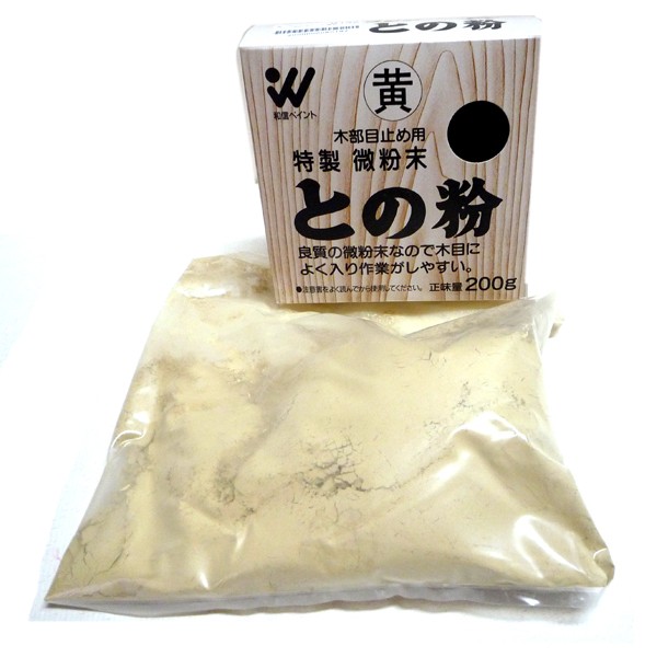 との粉はポアーステイン(着色剤)と混ぜ合せて使用すると、目止め着色が同時にできます。との粉は、ポアーステインの色によって使い分けます。鮮明な黄・オレンジ・レッド・グリーン などには白色を使用し、その他の茶系統の色には黄色のとの粉を混ぜます。※混合比率・・・との紛、約100gに対しポアーステイン約120mL●内容量・・・200g 【爆買】
