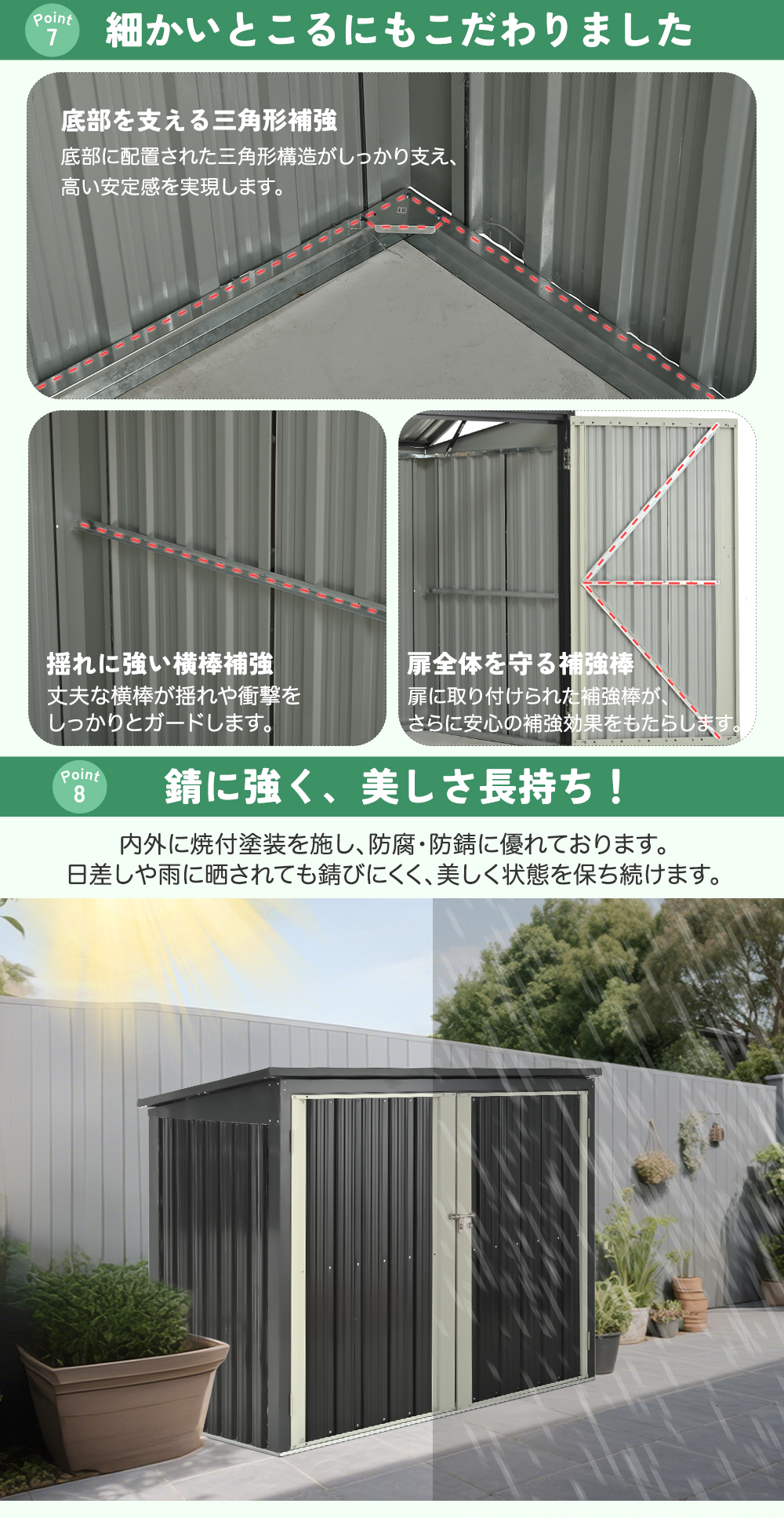 台風などの強風時に転倒し、重大なケがや収納物に損害を与える恐れがあります。