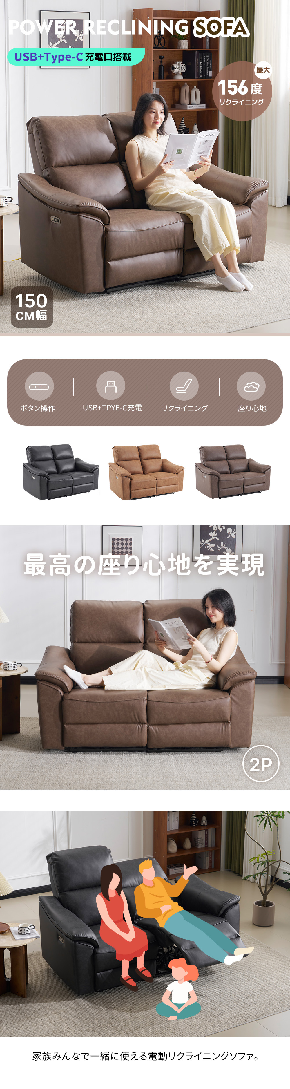 新作【USB+tpyc-C充電】156°調整 贅沢 リクライニングソファ 電動 リクライニング 二人掛け 電動リクライニング 電動ソファ 充電口 電動ソファー チェア 充電