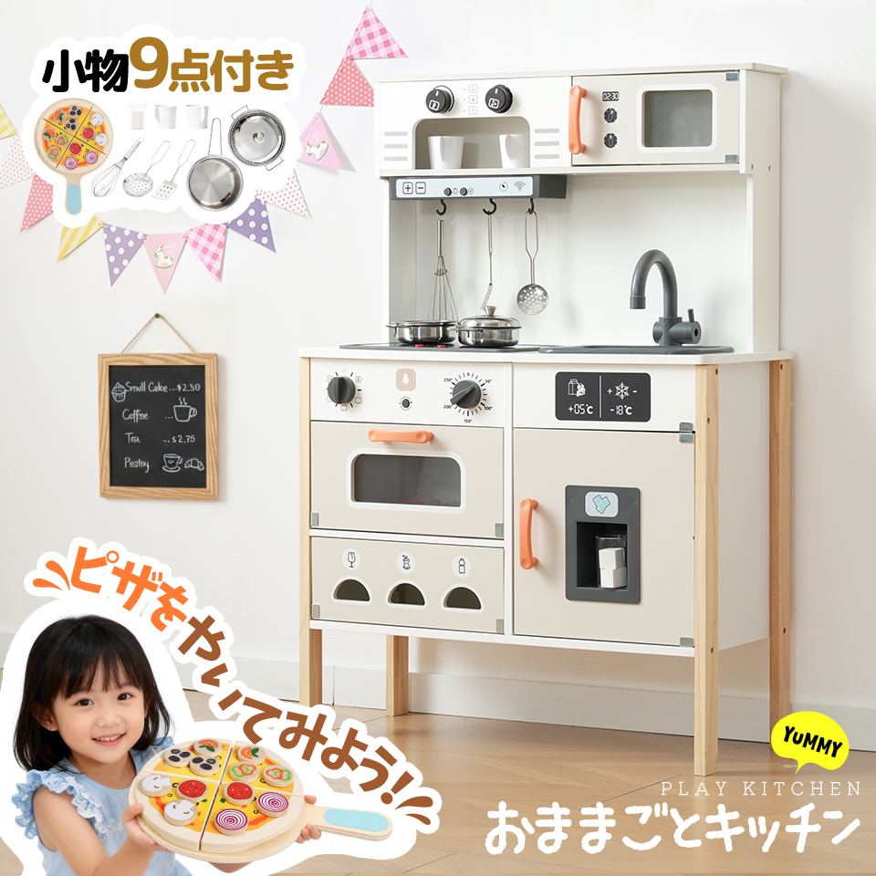 【ピザセット付き】おままごと キッチン 木製 おままごとセット 製氷機 調理器具付き 台所 知育玩具 電子レンジ プレゼント 子供 クリスマス 25年新作
