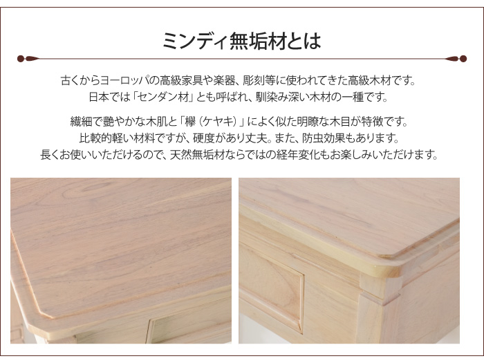 ミンディ材とは、日本では「センダン材」とも呼ばれ、古くからヨーロッパの高級家具や彫刻などに使われてきた高級木材です。通常の家具では背面や引き出しの内側などは合板を使用することが多いのですが、こちらの商品は見えない部分にもミンディ無垢材を使用しています。軽くて丈夫なミンディ材を使用した家具は、長くお使い頂け、天然木ならではの経年変化もお楽しみいただけます。