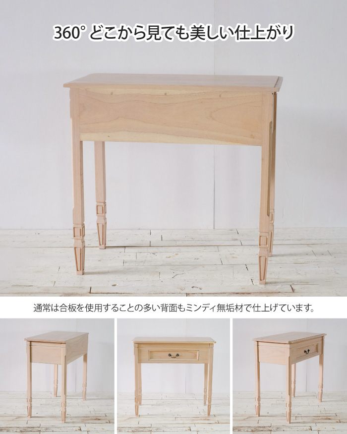 ミンディ無垢材を使用した、天然木の美しい木目とアンティークの雰囲気がおしゃれなコンソールデスクです。家具職人が1台1台、手作業で作り上げた、繊細さと味わいのある逸品です。