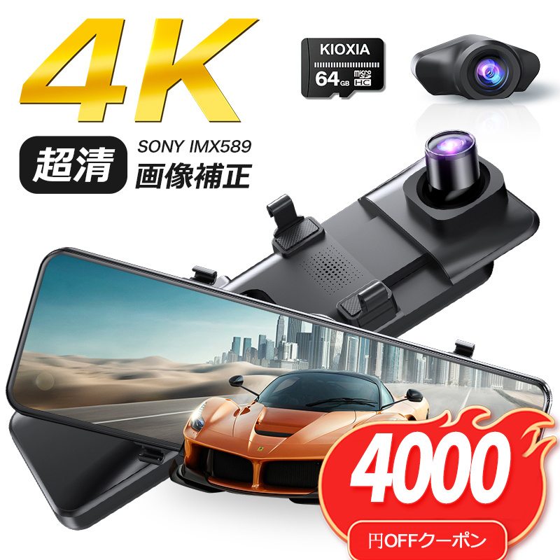 【48時間限定クーポンで9999円】ドライブレコーダー ミラー型 12インチ大画面 前後 2カメラ 4K画質 GPS追跡 800万画素 SONYセンサー WDR タッチパネル式