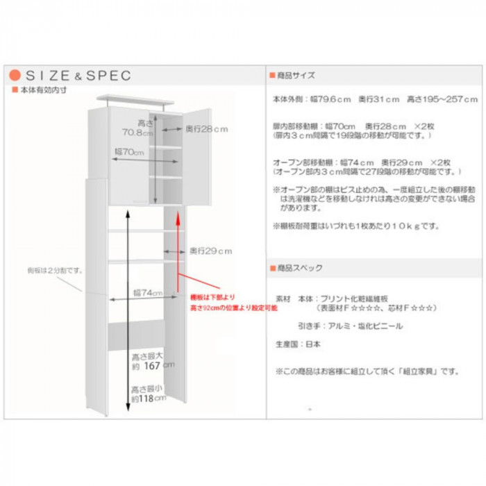| サイズ | 外寸:幅79.6×奥行(引手含む)33.4×高さ195〜257cm個装サイズ:95×39×35cm |