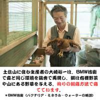 ・有機農業の為にBMW技術で土佐ジローを飼育 生産者 大崎裕一高知県土佐山は、有機の里として高知県内ではちょっと名の通った地域です。有機農業で利用しているBMW技術は、バクテリア・ミネラル・ウォーターの略語。自然浄化作用として、自然に備わる循環の力を利用した農業技術です。土佐ジローの環境を考えたときに、本当は森で放し飼いが望ましいですが、勿論できません。よってBMW技術で、森と同じ環境を鶏舎で再現しています。もちろん餌にも拘り、有機野菜や山にある自然の野草を与えています。寄生虫に悩まされた時には、土に石灰を入れて耕す事を繰り返えし、時間をかけ化学薬品は使わず育てています。