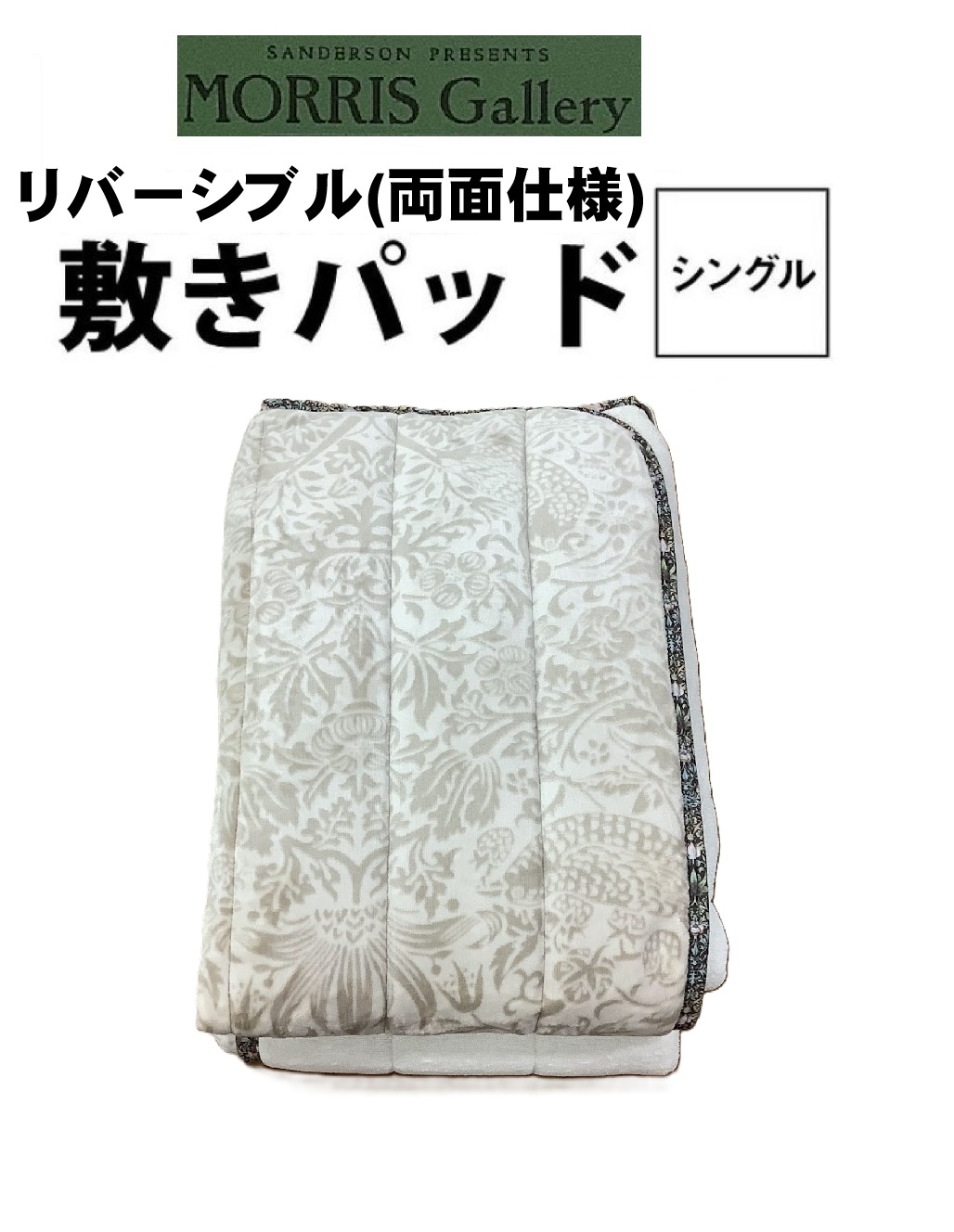 モリスのデザインで日々の風景に芸術を。19世紀、装飾デザインの新しい時代を切り開いたウィリアム・モリス。『モリス商会』の創業から160年以上たった今も輝き続けるモリスの独創的なデザインを生かしたコレクションをお届けします。【リバーシブル仕様敷きパッド】一つで二つの表情を楽しめる便利なアイテムです。両面を使い分けることで季節や気分に合わせることができます。寒い季節におすすめの暖かい毛布生地面には「いちご泥棒」のプリントを施しました。片面は無地のパイル生地で、便利にお使いいただけます。【高性能ゴムを使用】耐久性に優れた高性能ゴムバンドを採用し、敷きパッドがマットレスの上でずれることを防ぎ、しっかりと固定します。これにより、寝返りをうっても安心で、ストレスフリーな使用感を実現します。【洗濯機で洗える(洗濯ネット使用)】汚れてもすぐに洗えて、清潔に使えて便利です。モリスギャラリーのリバーシブル敷きパッドは、片面がなめらかで暖かい毛布素材、もう片面が綿のパイル素材になっているので、季節や体調に合わせてお使い頂けます。