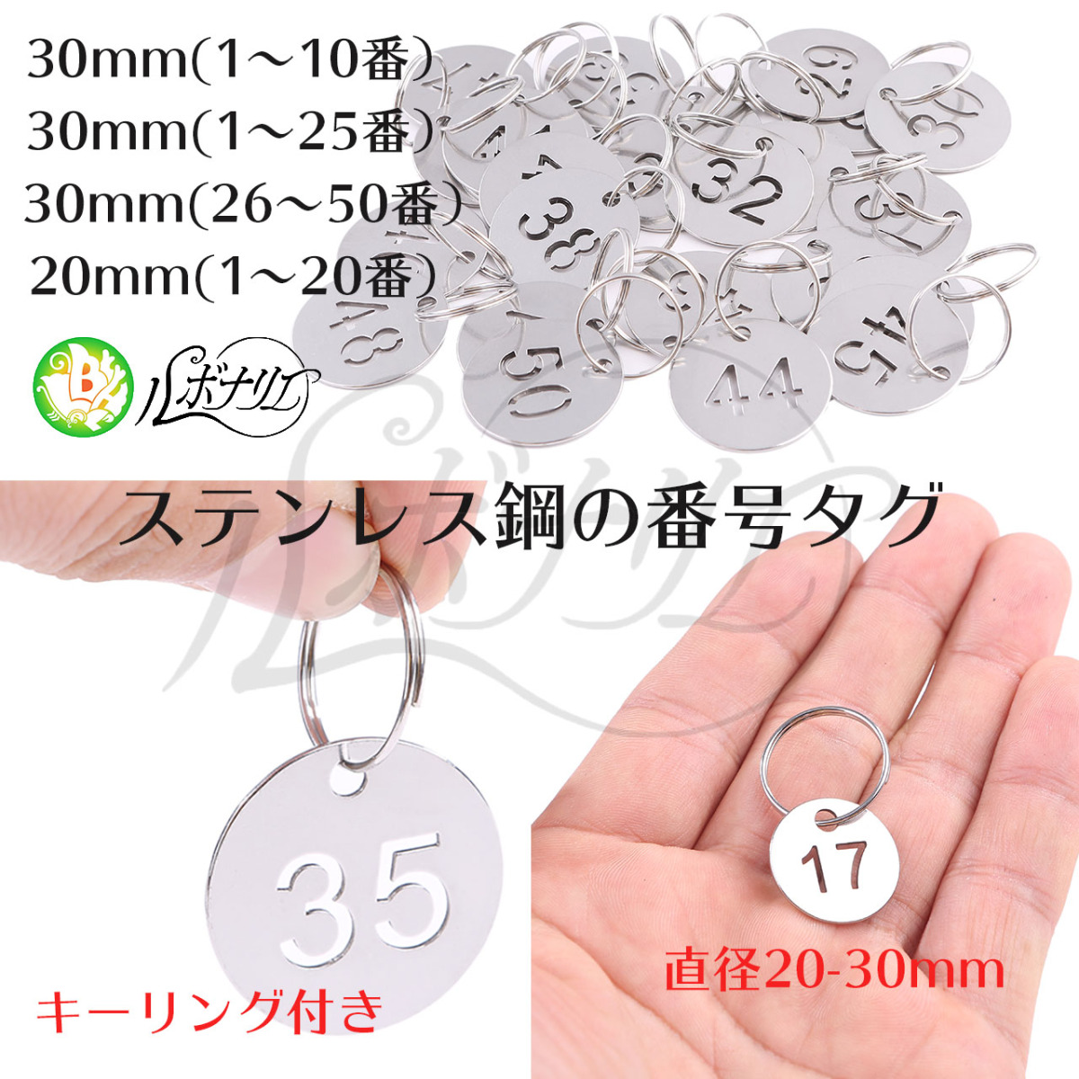 ・腐食に強いステンレス鋼の番号タグ。キーリング付きで、番号で鍵を分類分けすることができます。