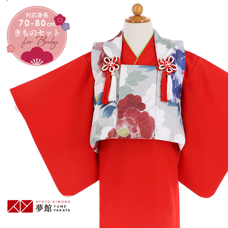 簡単に着せられる人気のベビー被布着物です。百日祝い(お食い初め)お正月 、端午の節句ハーフバースデー、お誕生日パーティ他にも様々なイベントやシーンで使えます。