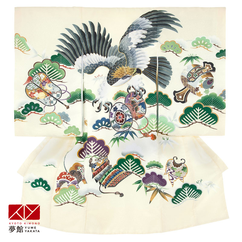 クリーム地に、鷹と鼓を描いたお着物です。全体に施された松の絵柄がほどよいアクセントになっています。