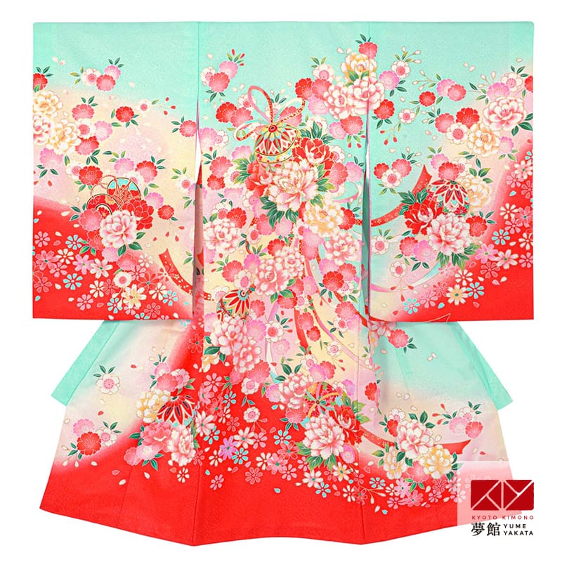 あられ模様のような光沢感のある地模様を薄青緑と赤に暈し、手毬と花薬玉を描いたお着物。薄青緑と赤の配色が目を惹く個性的なお品で、間には薄黄色と薄ピンクの暈しが入ってより華やかです。