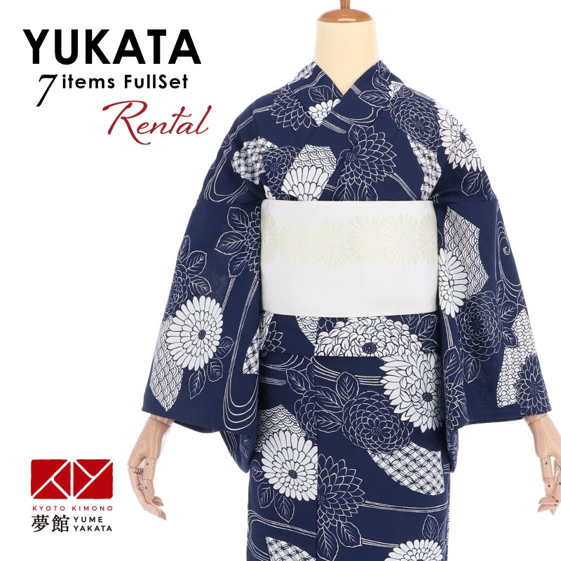 ポリエステル素材ですので、シワになりにくく、軽くて柔らかい、程よいシャリ感のある肌馴染みの良い生地感です。紺地に菊や流水・扇面模様が描かれた、年代問わず涼しげに着こなせる浴衣です。