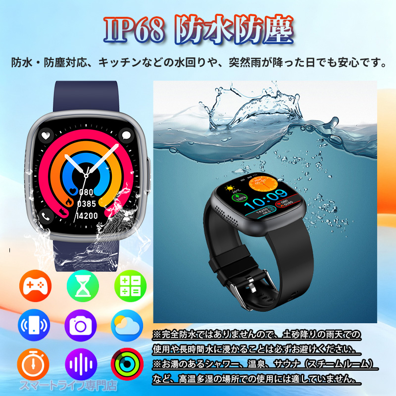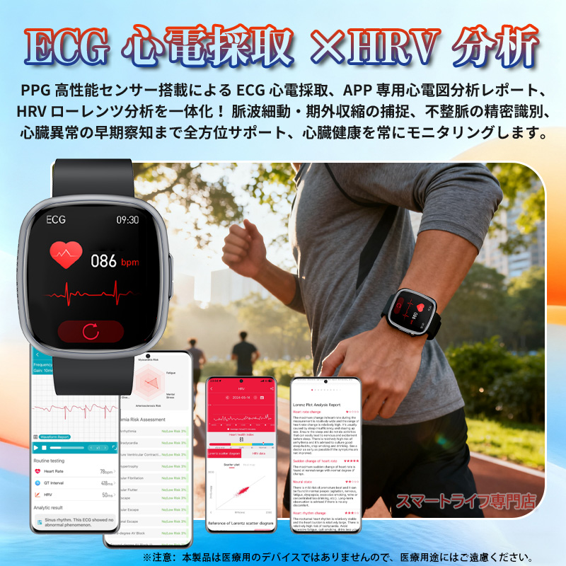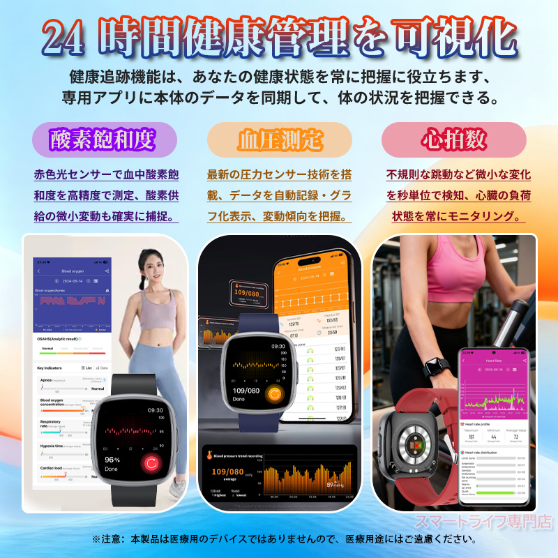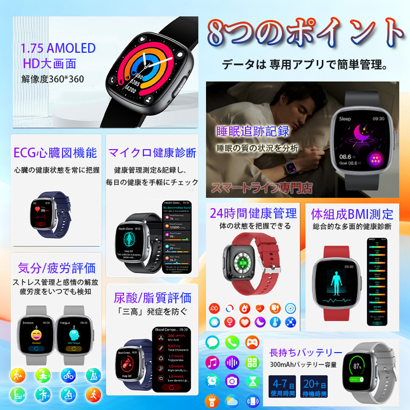 ●24H健康管理:血圧、ECGなど多機能測定、通話可能、カロリー、24時間健康管理、アラート、AI診断測定、睡眠監視や心拍数などの測定機能付き