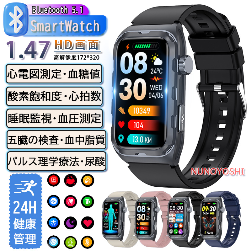 スマートウォッチ 日本製センサー 血糖値 心電図 心拍数 血圧測定 血中酸素 パルス理学療法 呼吸訓練 健康管理 尿酸 血中脂質 体温 歩数計 女性生理 医療レベル