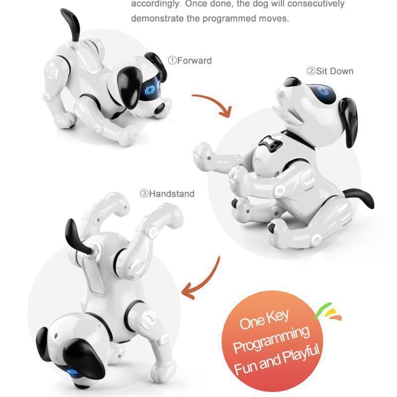 新犬型ロボット 2023新機能とデザインの犬型ロボットおもちゃで、1.走る 2.技を披露 3.ダンス、4.歌う 5.プログラミング 6.音声指示(英語のみ)7.吠える 8.甘える 9.タッチ機能 10.逆立ち、11.腕立て伏せ、12.お座り、13.挨拶、14.待て 15.伏せ、16.スリープ 。