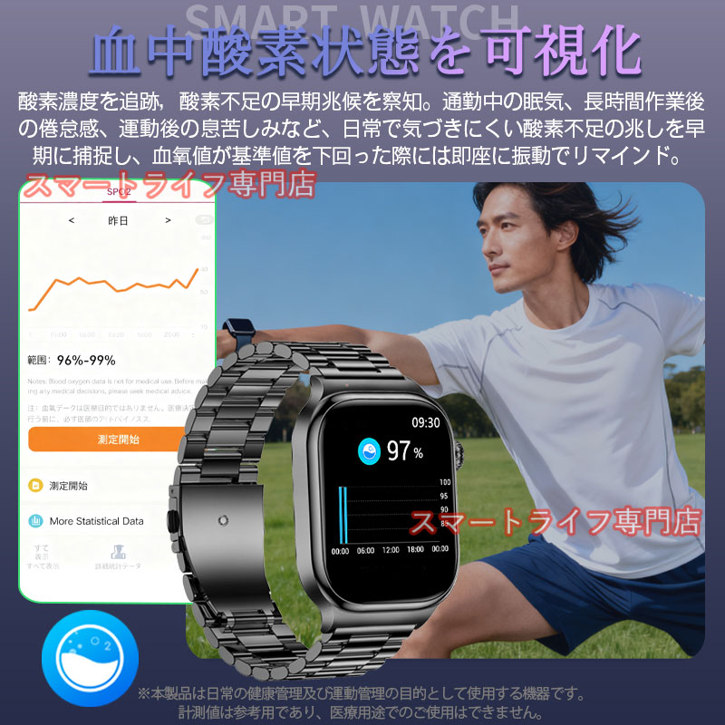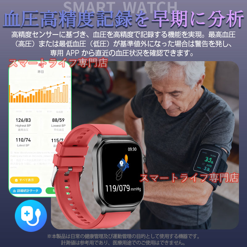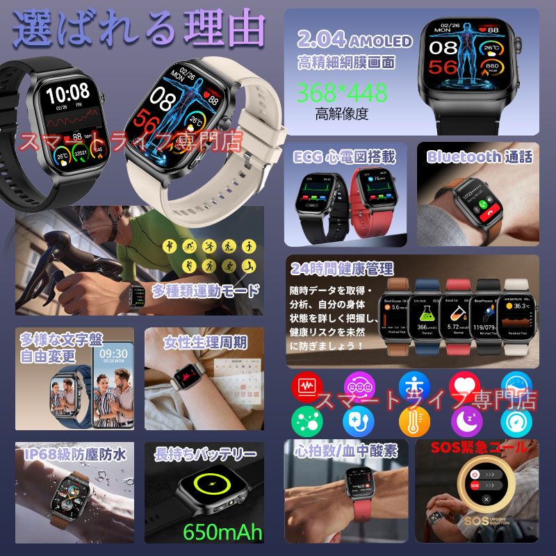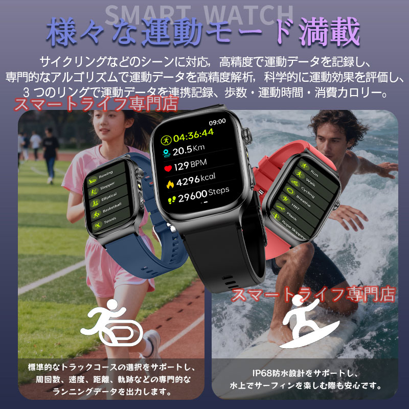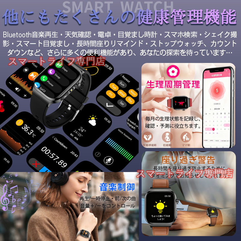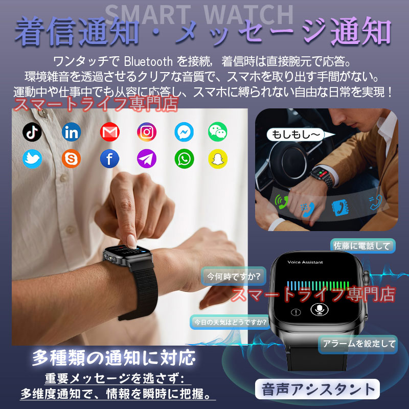 その他の機能:Bluetooth通話、SOS、スマートAI音声アシスタント、複数運動モード、女性の健康呼吸トレーニング、長時間座り警報、天気、メッセージ通知、音楽コントロール、タイマー、ストップウォッチ、アラーム、懐中電灯、スマホ探す