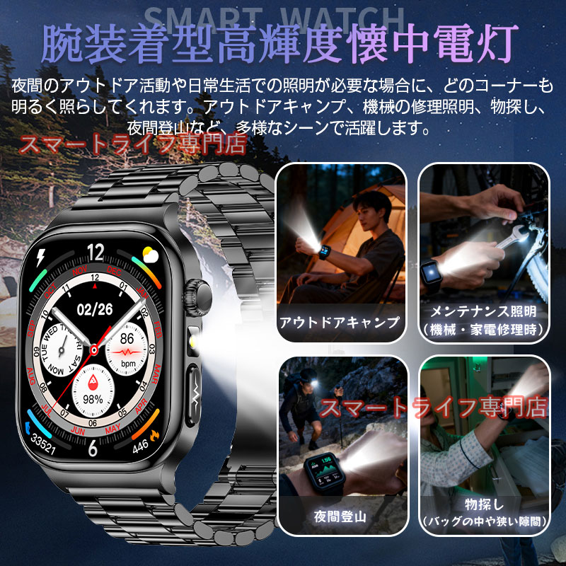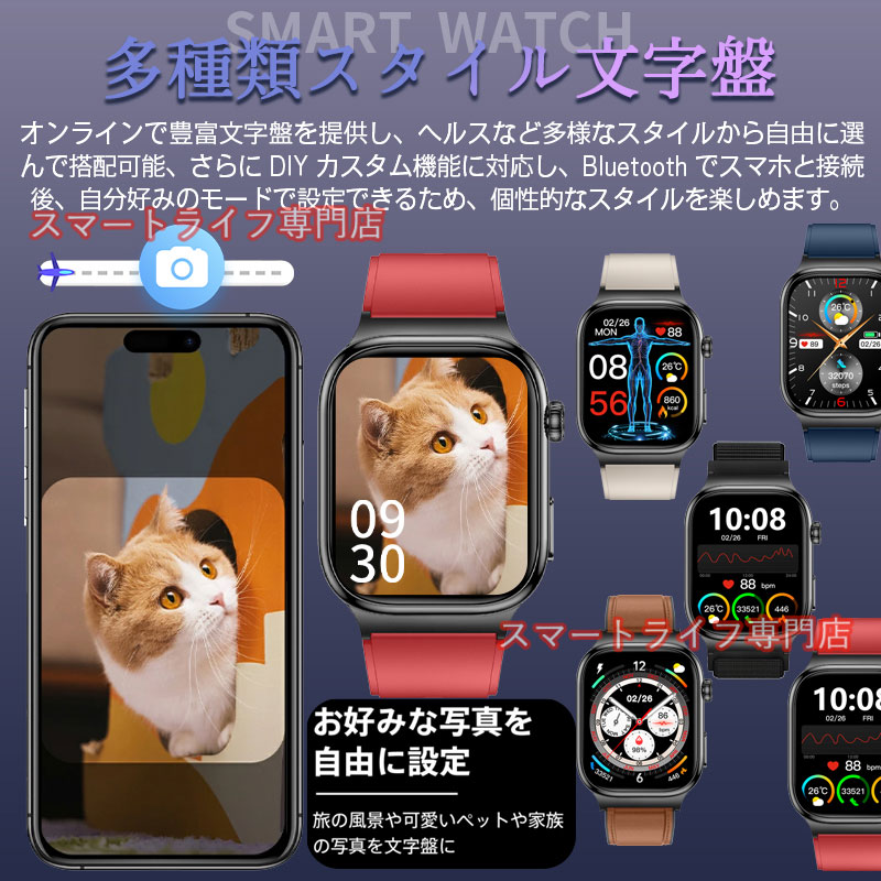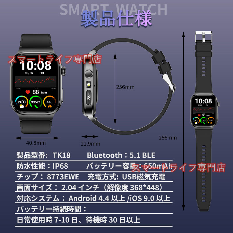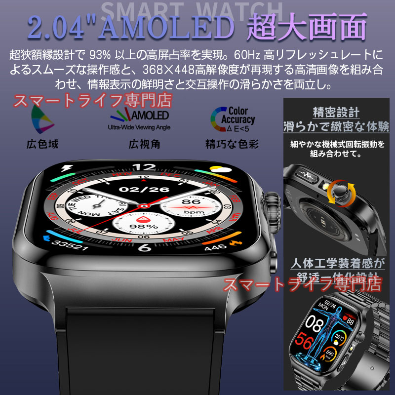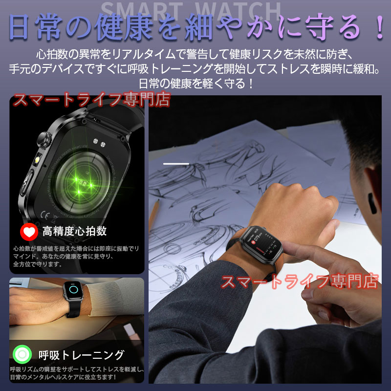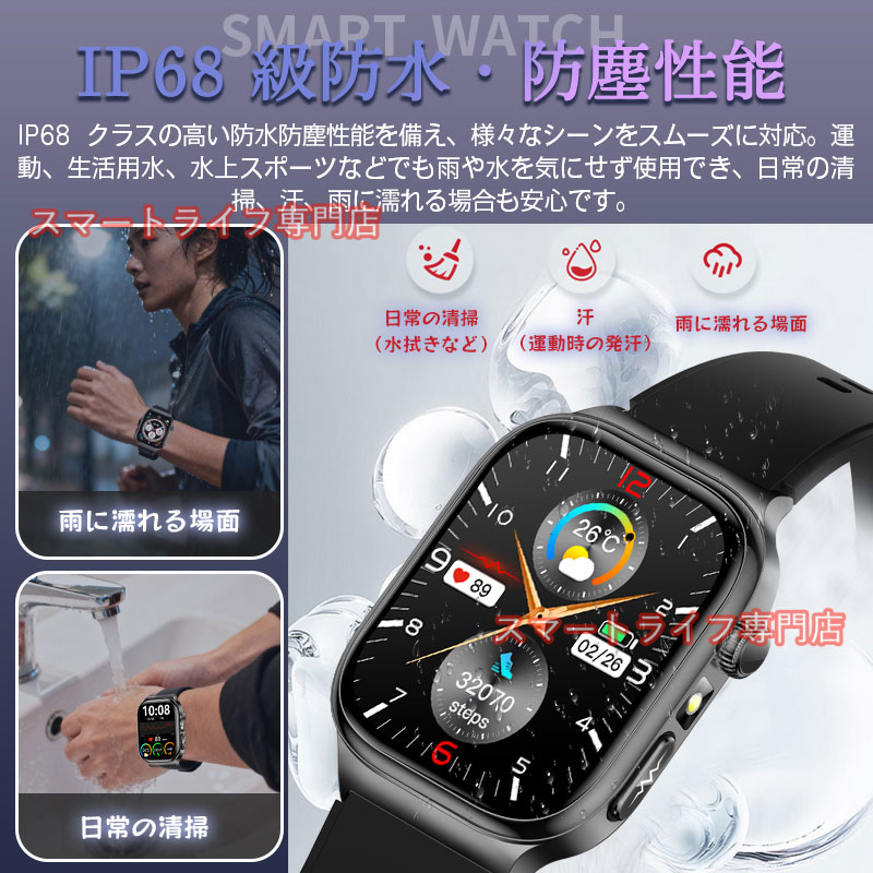 その他の機能:Bluetooth通話、SOS、スマートAI音声アシスタント、複数運動モード、女性の健康呼吸トレーニング、長時間座り警報、天気、メッセージ通知、音楽コントロール、タイマー、ストップウォッチ、アラーム、懐中電灯、スマホ探す