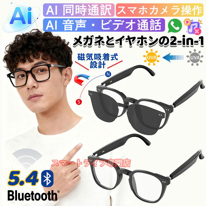 スマートグラス 翻訳メガネ 2種レンズ付き 通話機能 オーディオグラス 磁気吸着式レンズ ワンタッチ イヤホンメガネ サングラス ワイヤレスメガネ 170言語翻訳