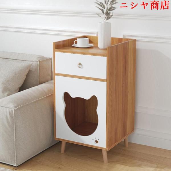 北欧風ベッドサイドテーブル ねこ家具 ナイトテーブル 引き出し付きベッド横 サイドテーブル 木製 収納 キャビネット おしゃれ 屋内猫用キャットハウス 組立簡単