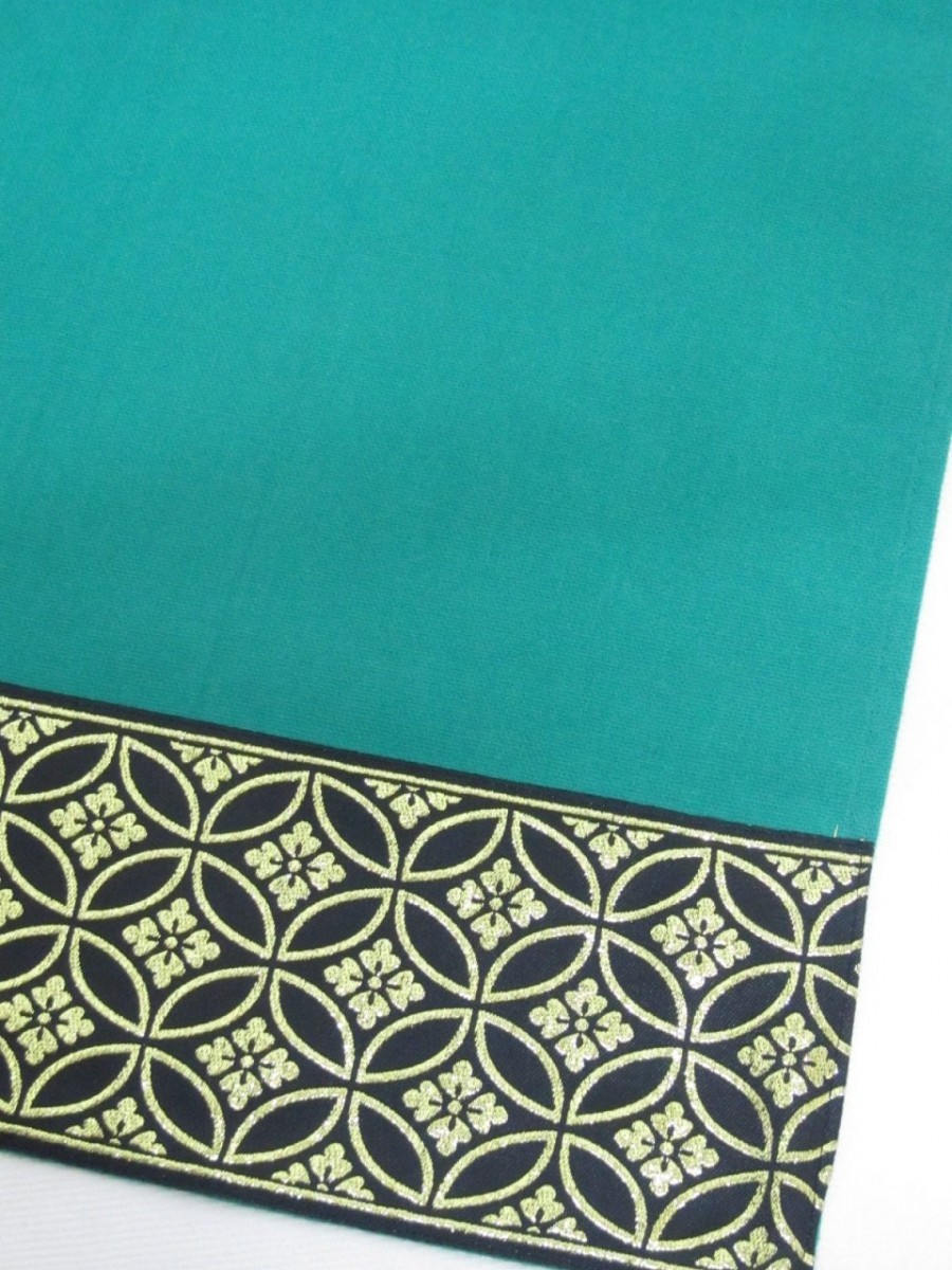 商品詳細 五月人形を彩る緑の敷布です。飾り台の下に敷いて使います。おめでたい七宝(しっぽう)模様の柄です。