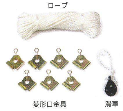 商品詳細 鯉のぼり6?7m用です。(ロープ、滑車1個、ひし形金具7ヶ入り) 痛んでしまったり切れたときの交換用にいかがでしょうか?