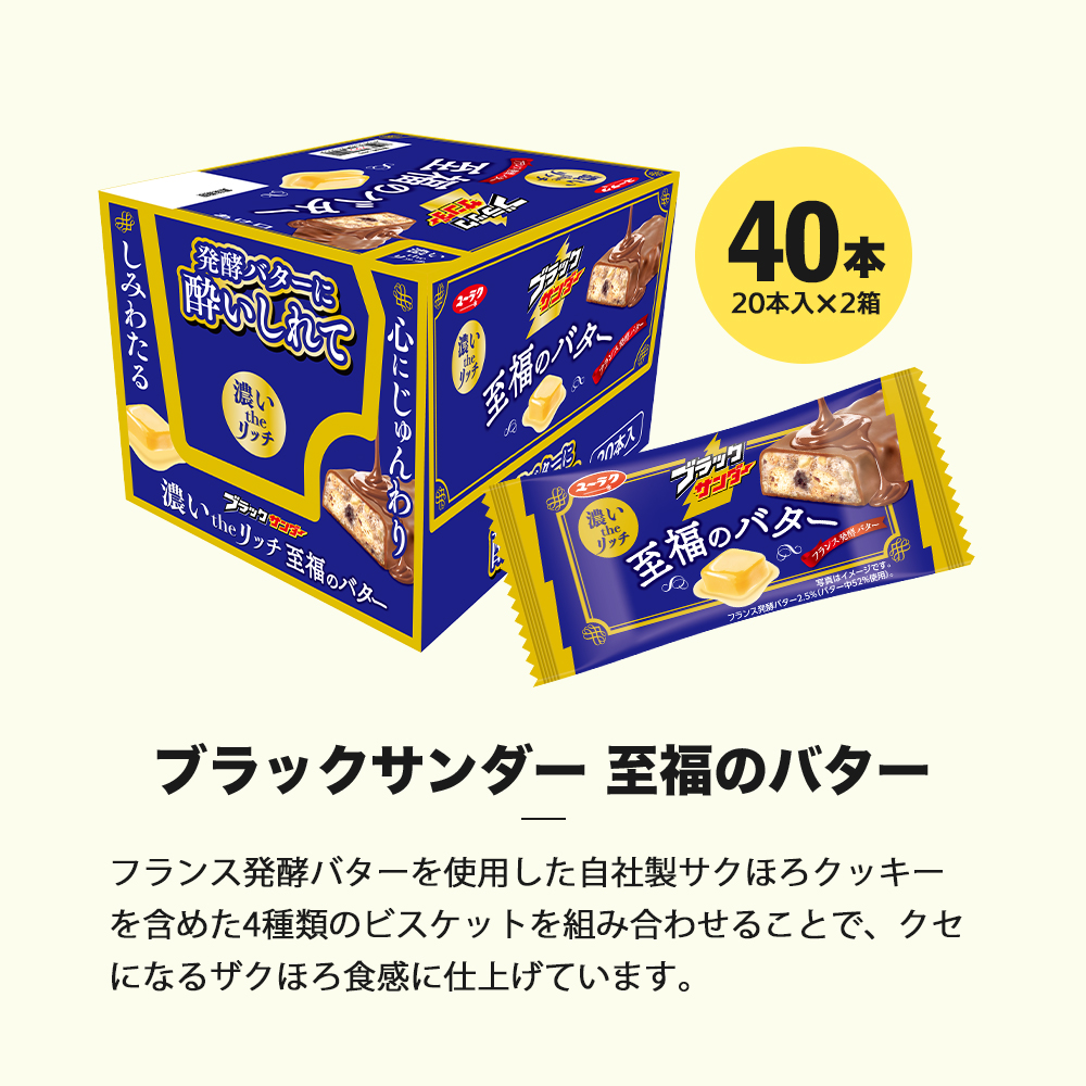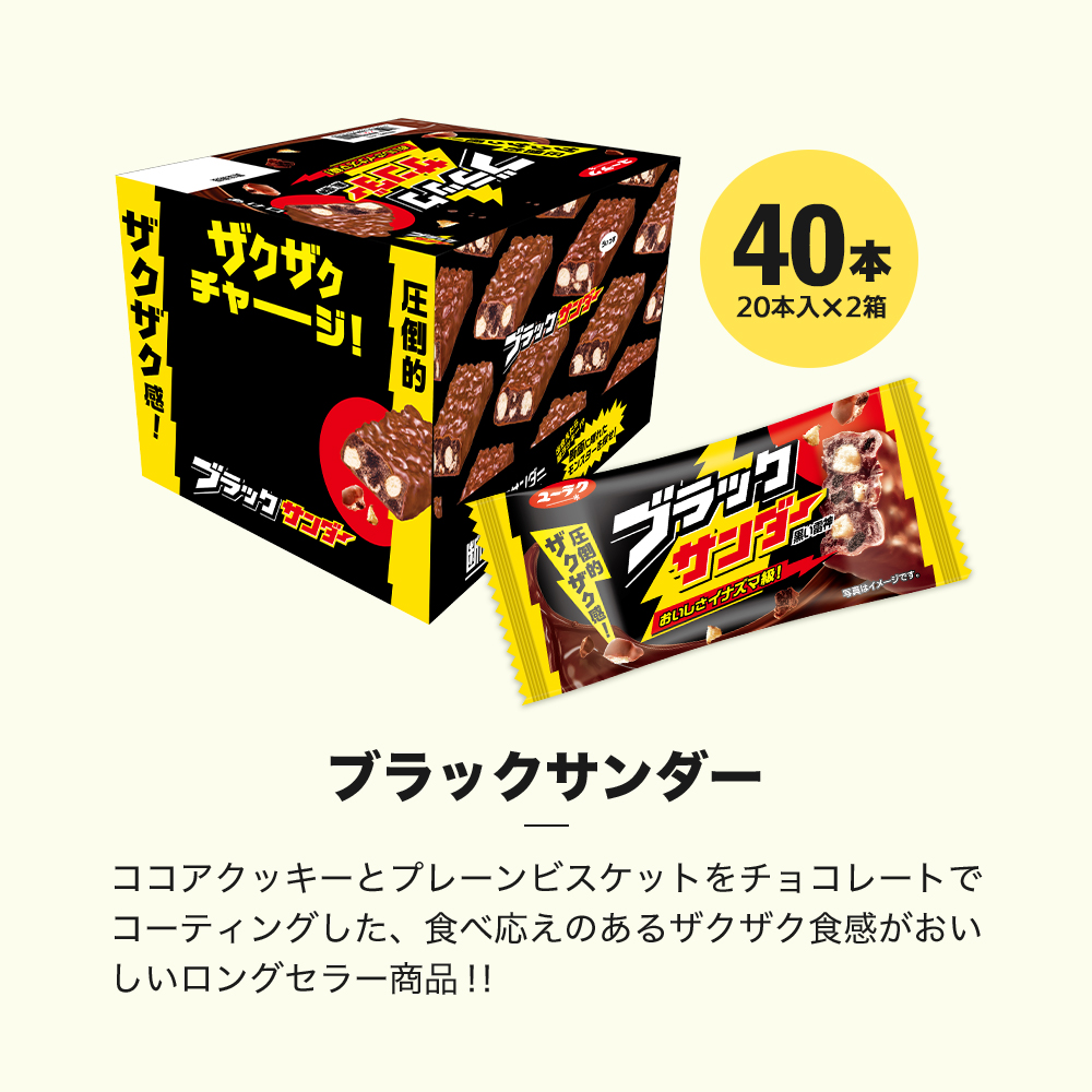 | 内容量 | <ブラックサンダー>1箱(20本入) <ブラックサンダー 至福のバター>1箱(20本入) <柿の種サンダー>1箱(20本入) |