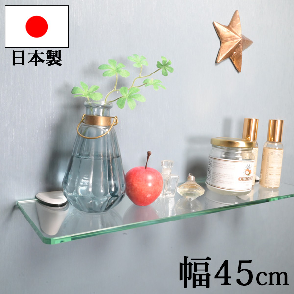 『 強化ガラス ウォールシェルフ幅45cm x 12cm』(壁 壁掛け 棚 飾り棚 ガラス棚 おしゃれ スリム シンプル モダン 店舗 陳列 什器 ディスプレイ 高級感 長い )