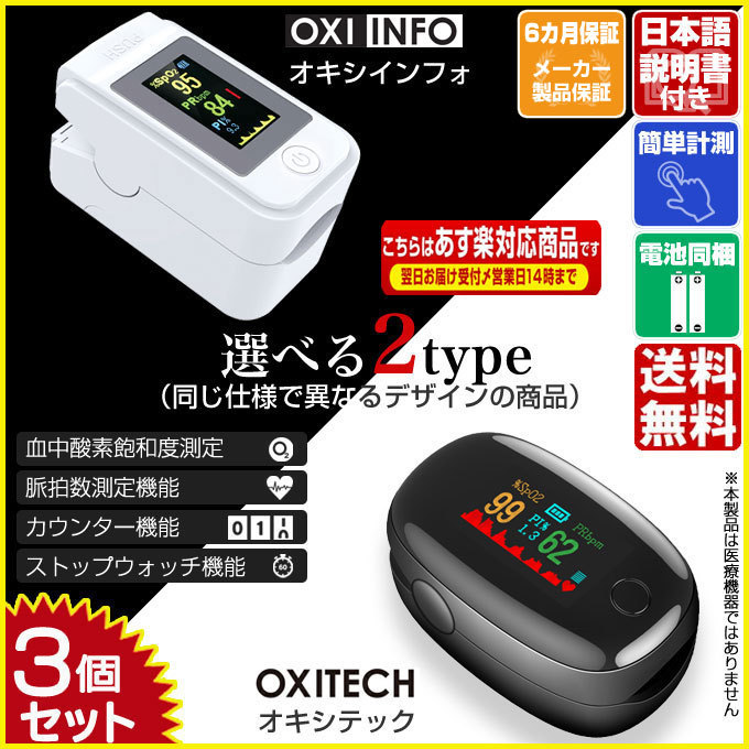 | 商品仕様 | 【商品名】デジタル酸素飽和度メーター 【型 番】 ブラック(オキシテック)TOA-OXITC-001 ホワイト(オキシインフォ)TOA-OXINF-001 【外形寸法】 ブラック(オキシテック)約W58xH35xD37mm ホワイト(オキシインフォ)約W58xH34xD32mm 【重 量】約29g(バッテリー含まず) 【電 源】単4型 アルカリ乾電池x 2本 【測定範囲】酸素飽和度70%〜99% 脈拍数30〜240bpm 【測定精度】酸素飽和度 70〜99%±2% 脈拍数 ±2%または±2拍分 |