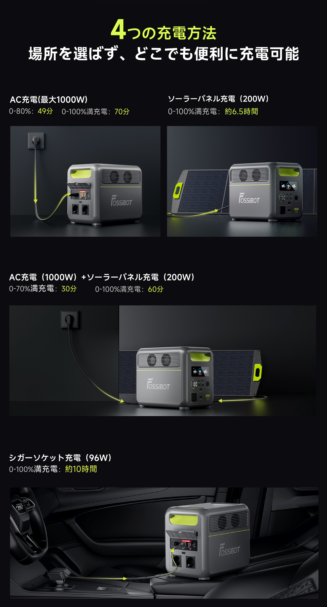 FOSSiBOT ポータブル電源 1024Wh ソーラーパネル200W セット リン酸鉄 4000回サイクル 1024Wh 大容量 高出力 正弦波 10年寿命 50/60Hz ポータブルバッテリー キャンプ 7年保証 別売ソーラーパネル対 車中泊 防災 車載冷蔵庫に充電