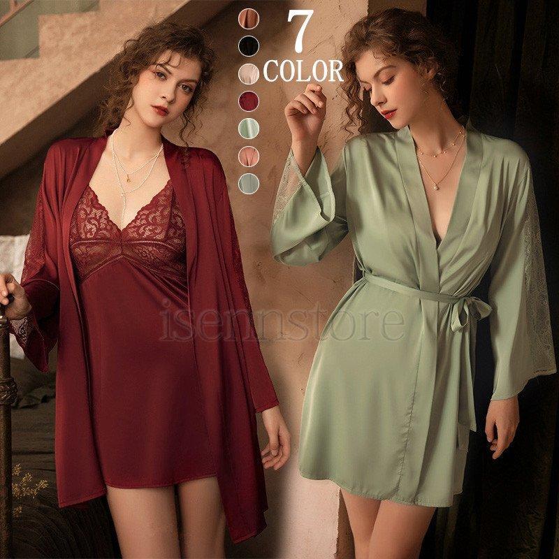 7色 レディース ネグリジェ ナイトガウン パジャマ ナイトウエア ランジェリー 長袖 ナイトローブ 花レース サテン 部屋着 光沢感 エレガント